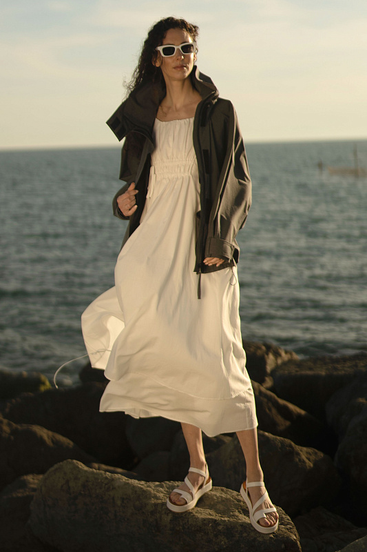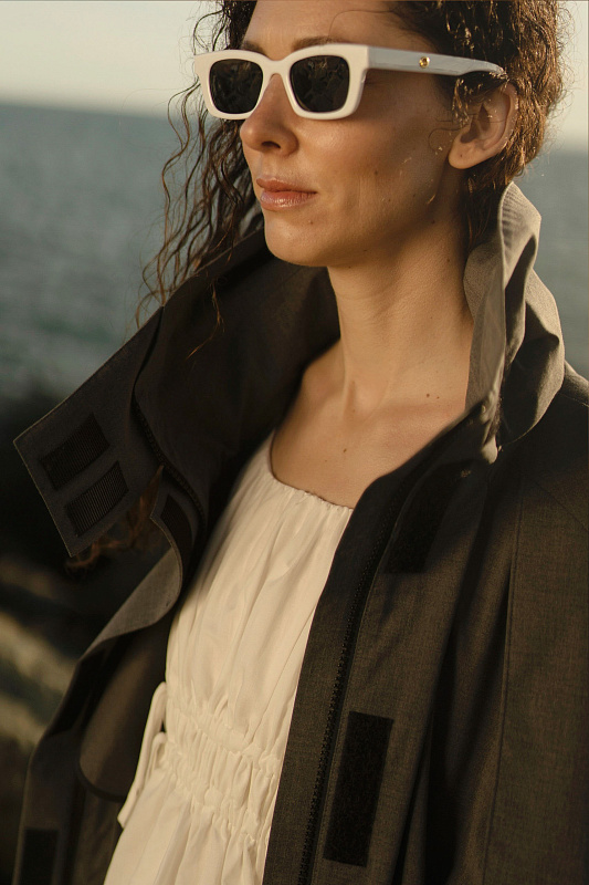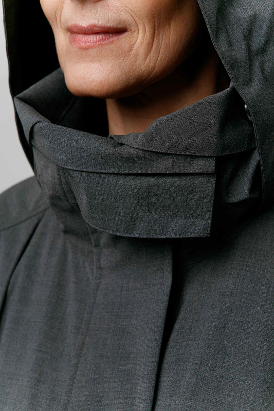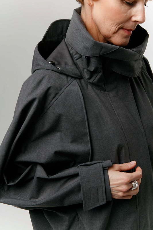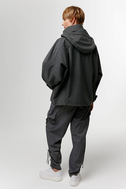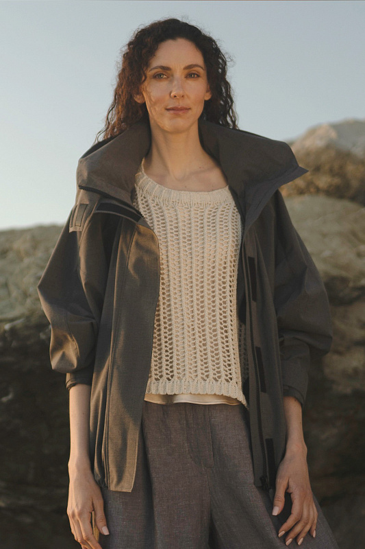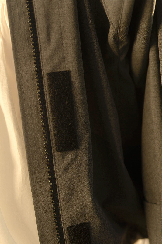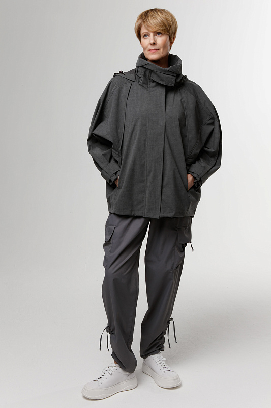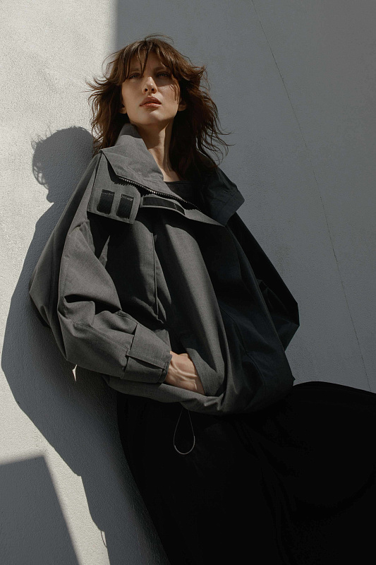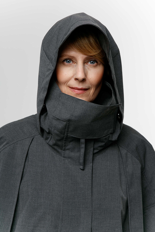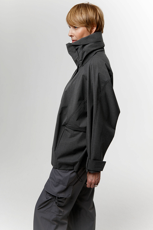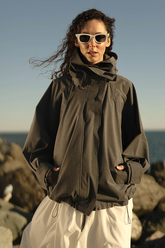 Эффектная куртка сложной дизайнерской конструкции. Застежка на тракторную молнию и мембранные липучки. Капюшон и низ куртки можно затянуть на резинку с фиксатором. Удобные карманы. Куртка без подкладки.