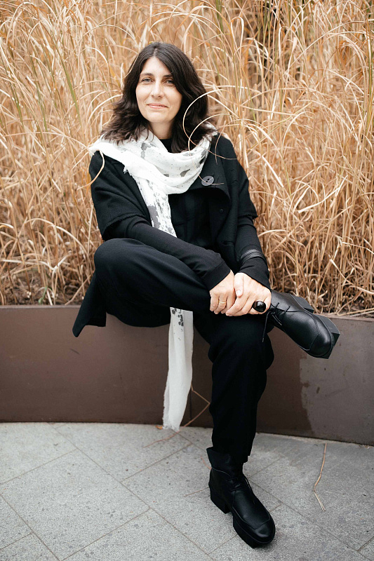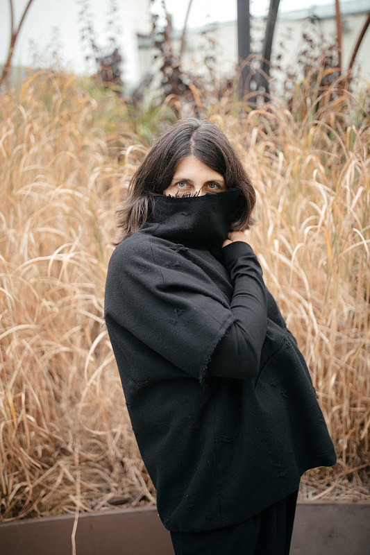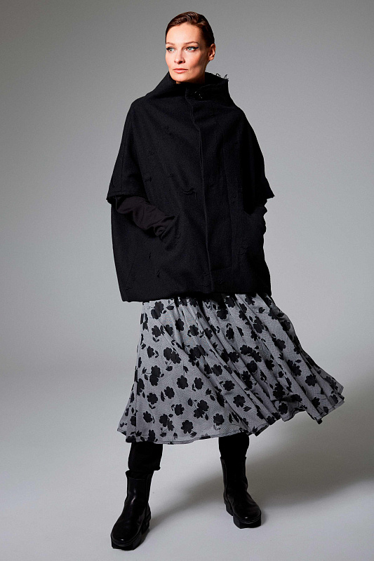 Шерстяная куртка пончо с прорезными карманами. Рукава куртки выполнены из плотного эластичного трикотажа. Супатная застежка на больших пуговицах . Оригинальная ткань в стиле гранж.