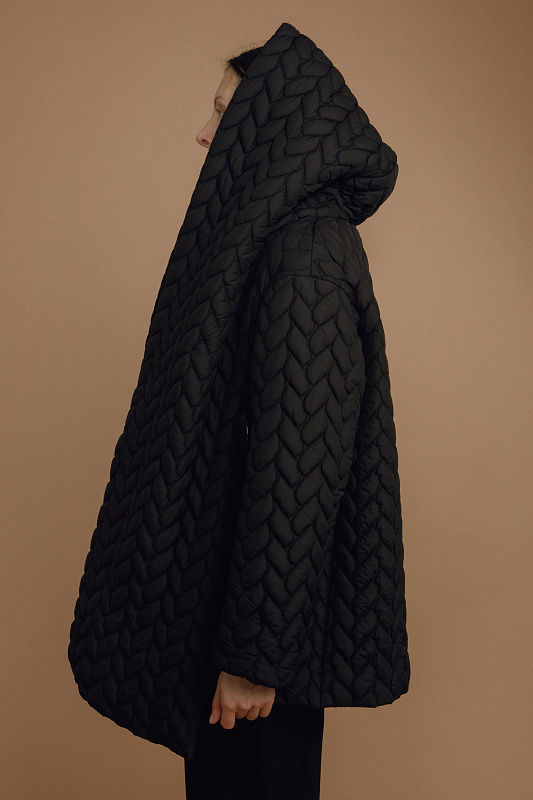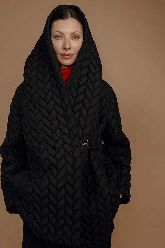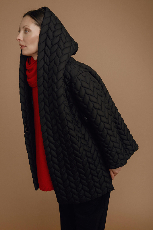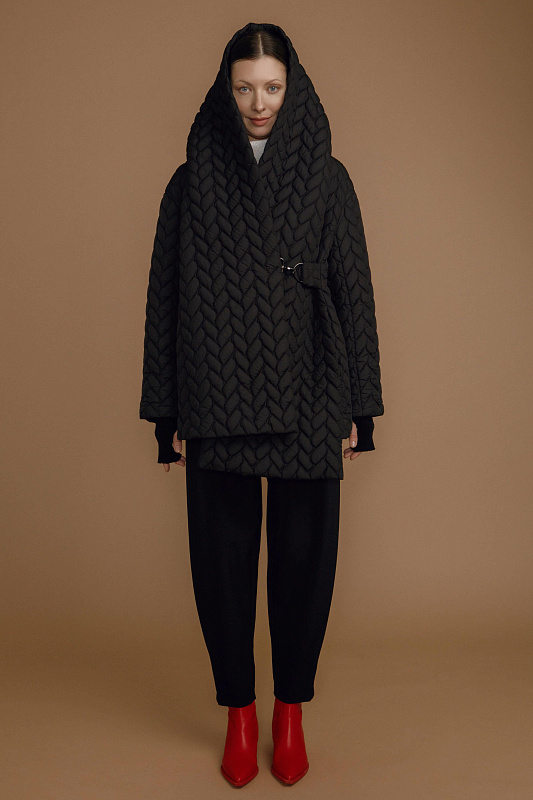 Легкая и одновременно теплая куртка с капюшоном оригинальной дизайнерской конструкции с асимметричными полочками. Модель выполнена из ткани со стежкой, напоминающей косы объемного плетения. Застежка на карабине чуть више талии, внутри полочка фиксируется с помощью завязки, что позволяет регулировать посадку. Воротникшалька, переходящий в эффектный капюшон. Шелковистая вискозная подкладка. Функционльные карманы в боковых швах.