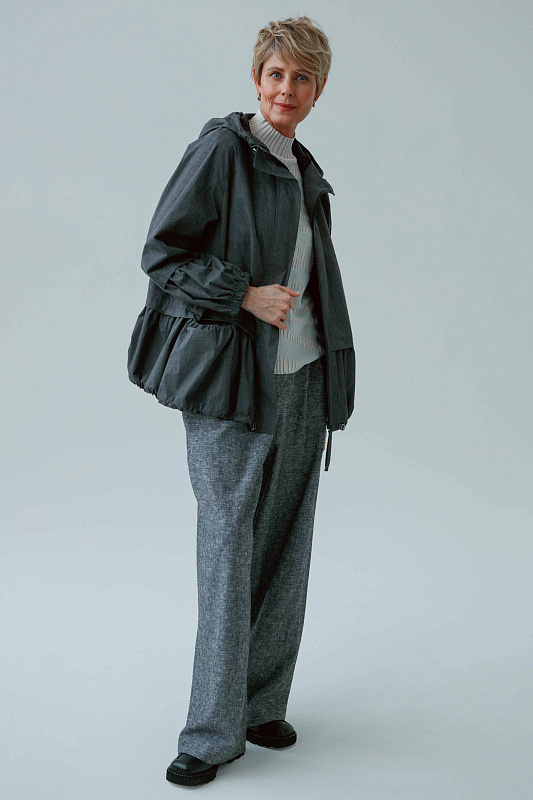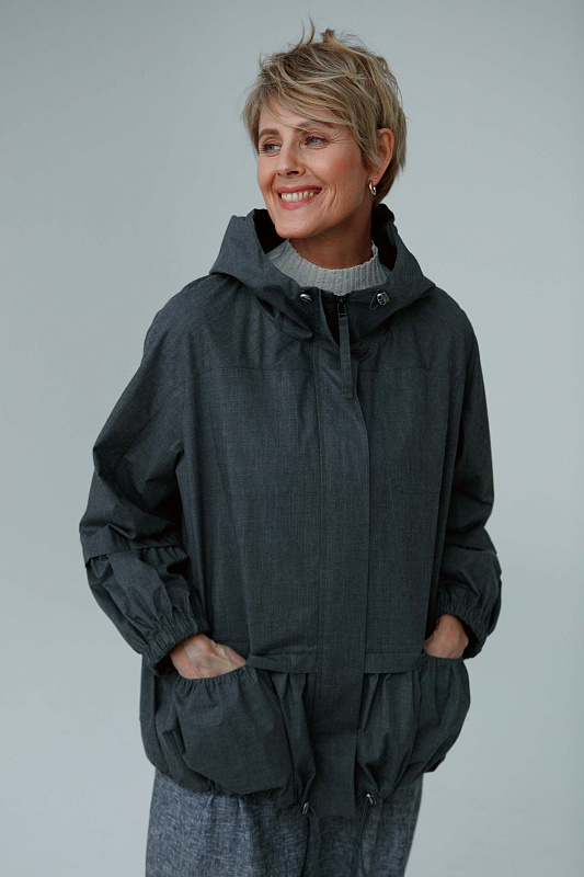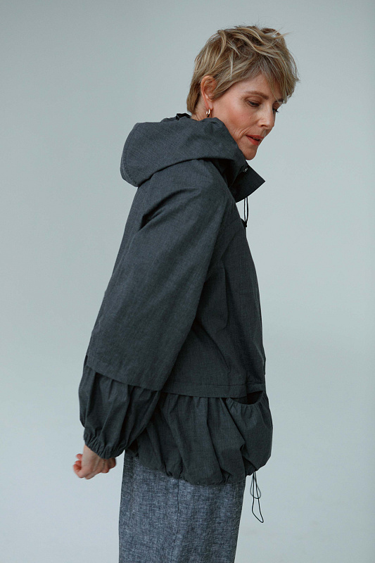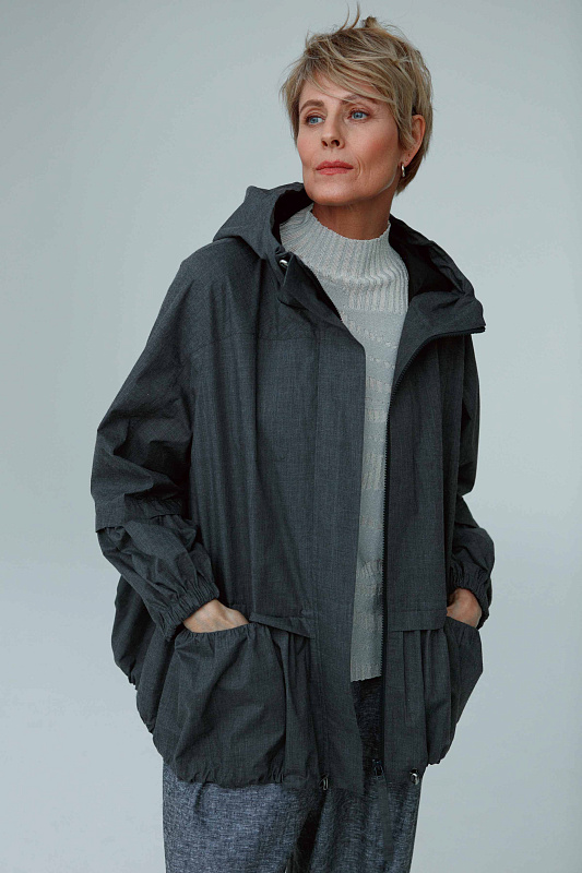 Куртка ветровка на молнии оригинальной дизайнерской конструкции. Капюшон и низ изделия на тонкой резинке с вазможностью фиксации. Рукава на легкой резинке. По передним полочкам с внутренней стороны два кармашка.