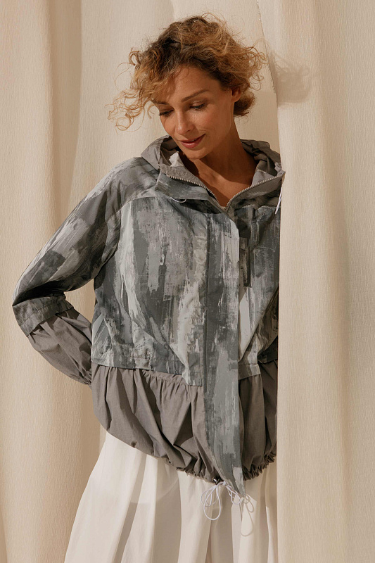 Эффектная ветровка оригинальной дизайнерской конструкции из комбинированной плащевой ткани. Капюшон и низ куртки на резинке с возможностью фиксации. Застежка - тракторная молния. Два удобных кармана.