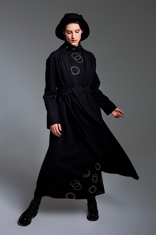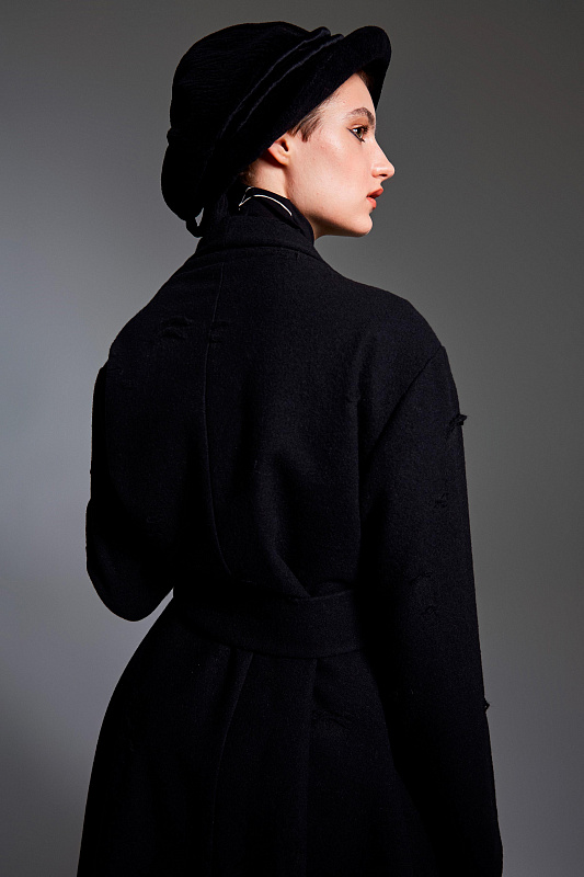 Шерстяное пальто силуэта ампир. Пальто имеет внутренние завязки,  застегивается на кнопку. В комплекте есть пояс. Низ изделия не обработан. Оригинальная ткань в стиле гранж.