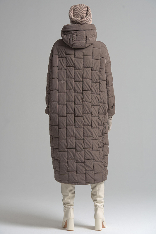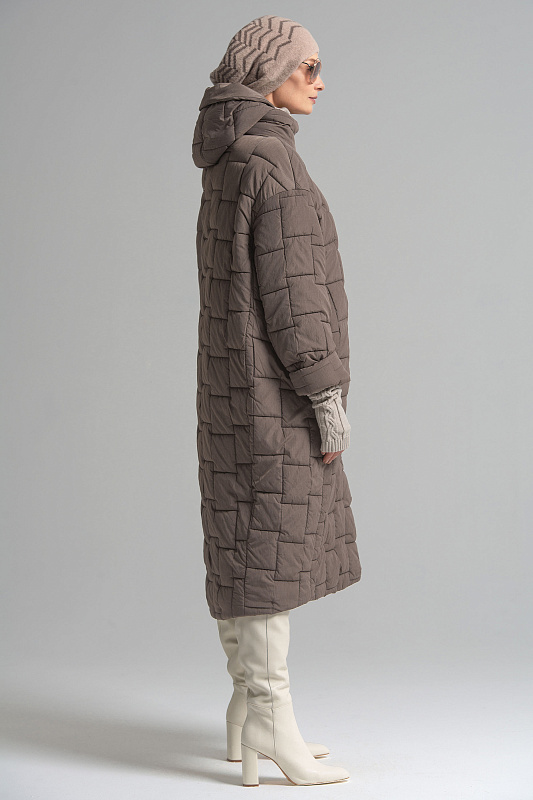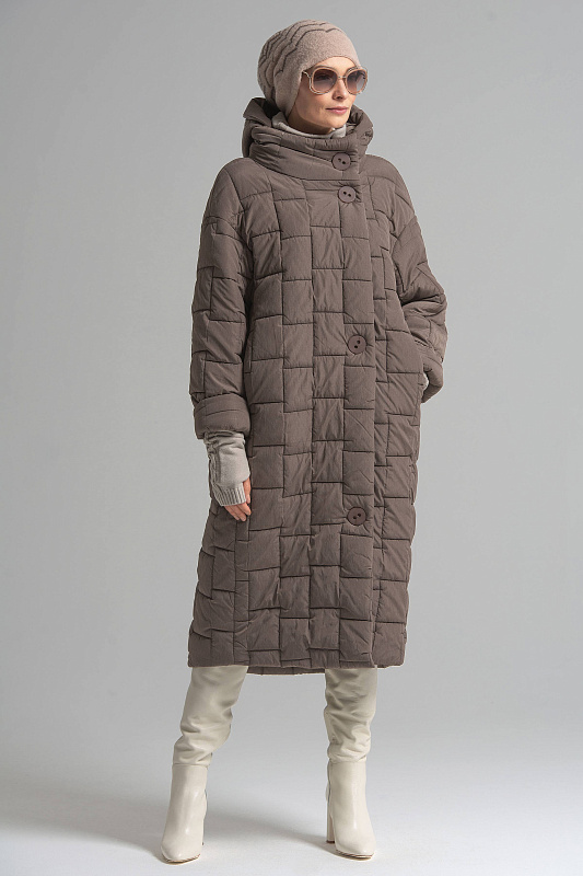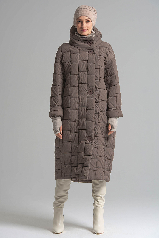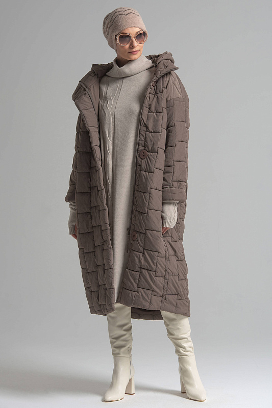 Длинное теплое пальто оригинальной дизайнерской конструкции на подкладке. Прямая линия борта, удобная тракторная молния, большие пуговицы,капюшон утепленный, съемный на молнии, карманы в шве. Ткань – изысканная стежка, подкладка – нежная вискоза.