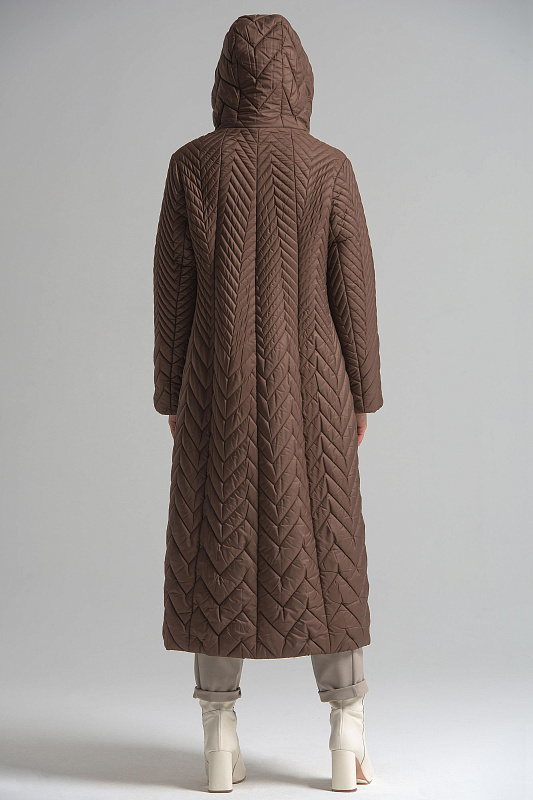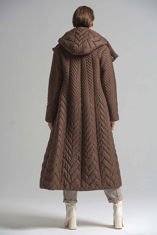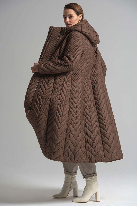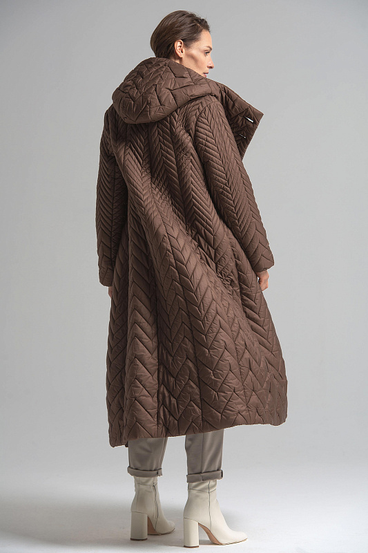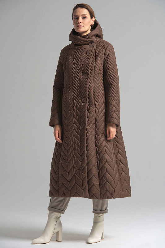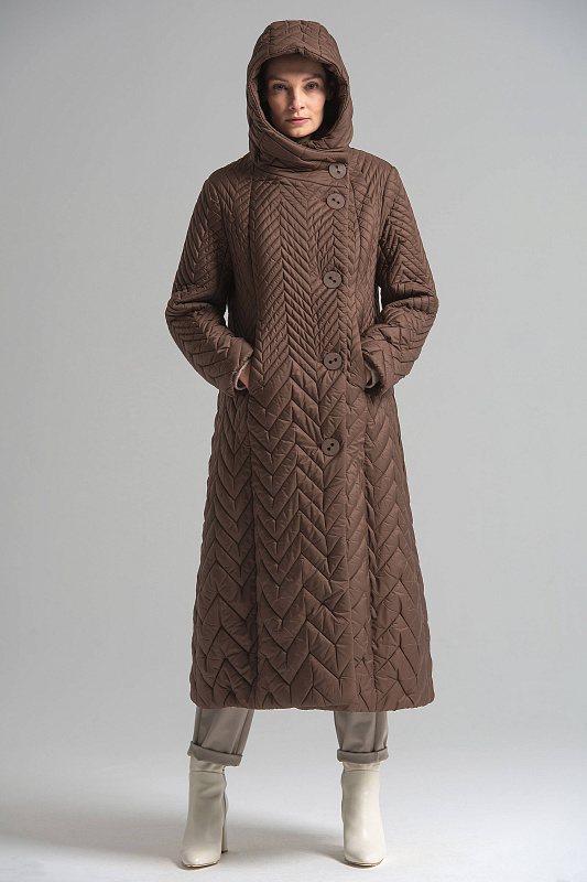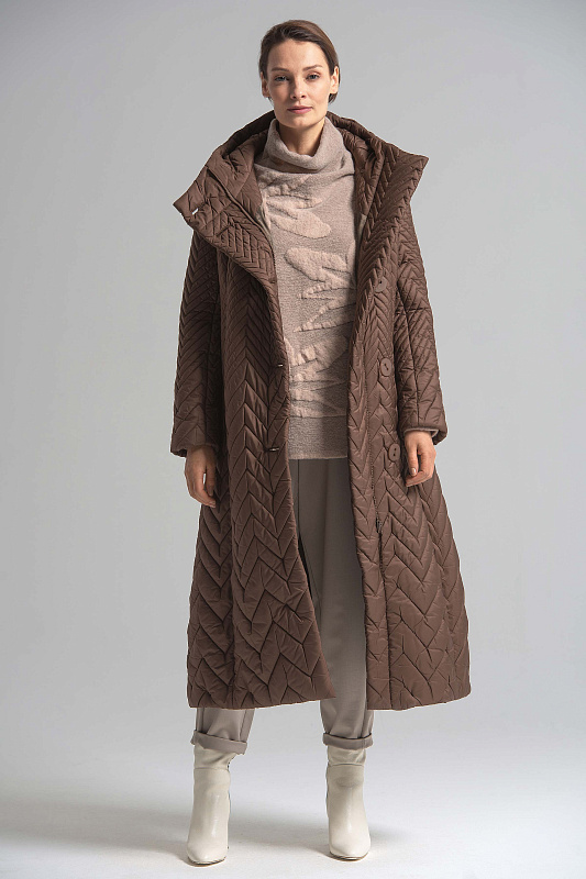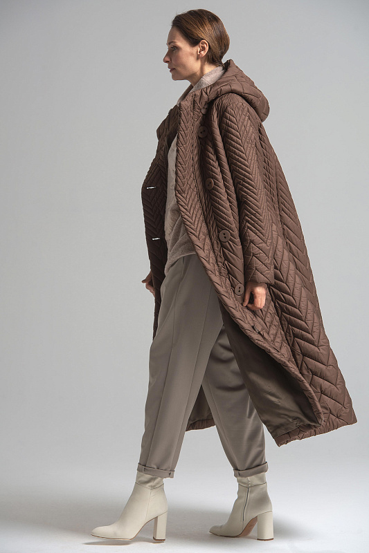 Длинное теплое пальто А-силуэта на больших оригинальных пуговицах, на подкладке. Косая линия борта, удобная тракторная молния, утепленный притачной капюшон, карманы в шве. Ткань – изысканная стежка «зигзаг-бордюр», подкладка – нежная вискоза.