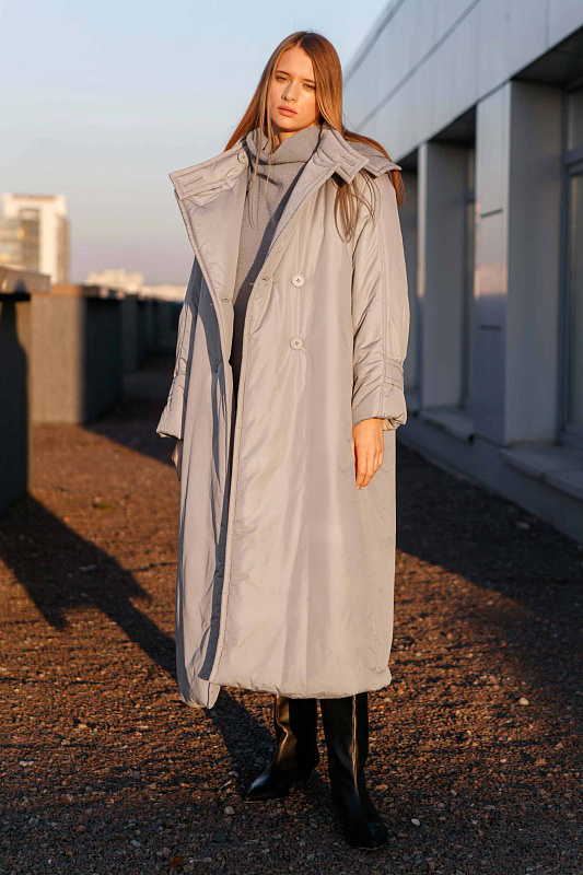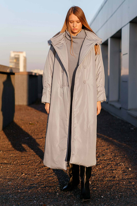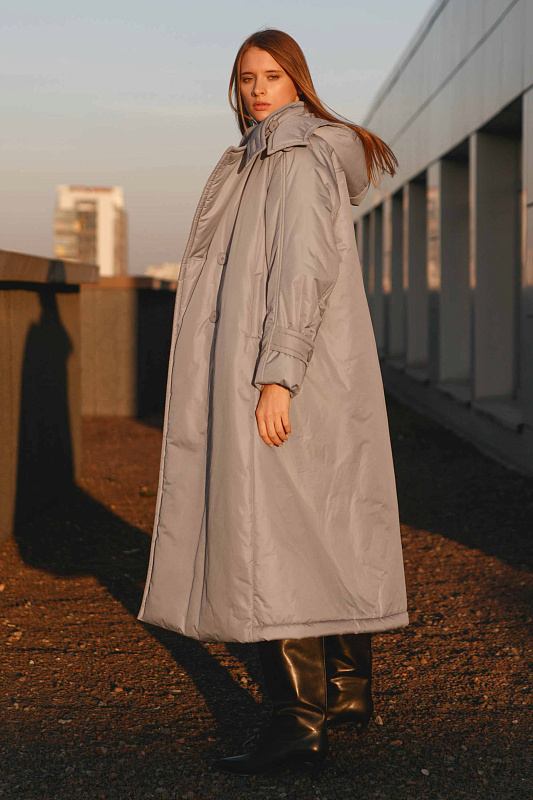 Лаконичное и одновременно стильное, длинное и уютное пальто с современным наполнителем. Двойной воротник-стойка с запахом и теплый отстегивающийся капюшон с застежкой на пуговицу защитят от ветра и холода. Комфортный крой в стиле оверсайз с цельнокройной кокеткой по спинке, переходящей в рукава. Застежка на пуговицы с внутренней и внешней стороны. Удобные карманы в боковых швах. Свободные рукава дополнены изысканными патами на манжетах. Мягкая подкладка из шелковистой вискозы.