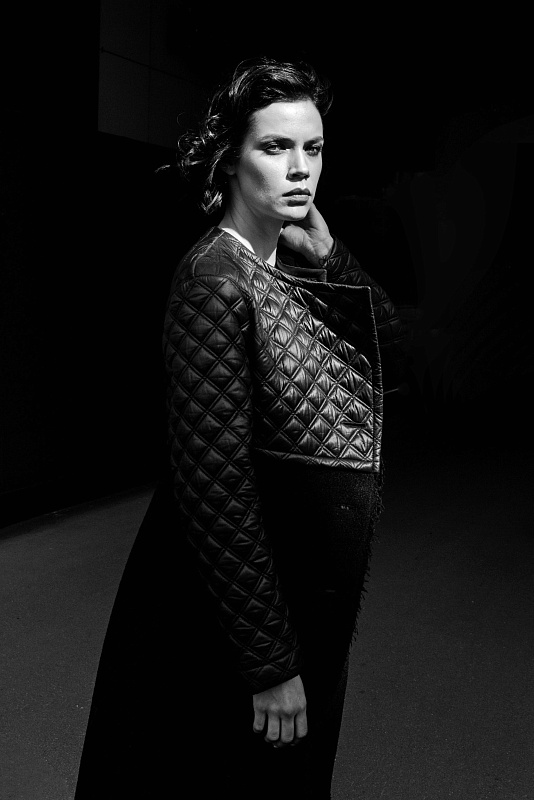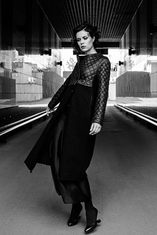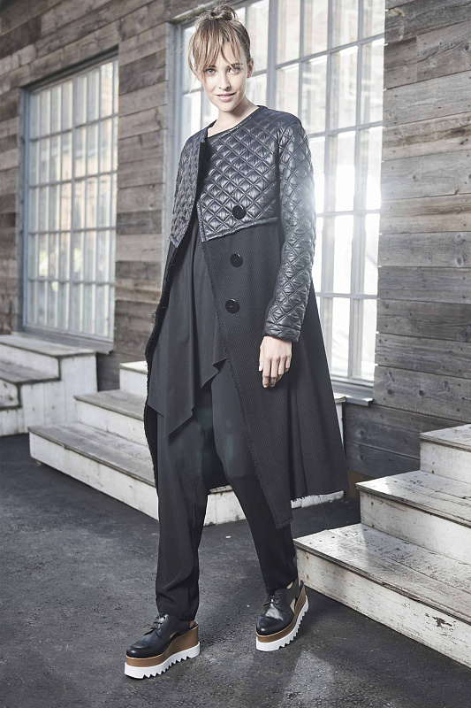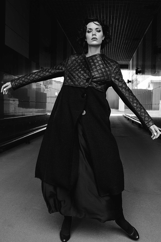 Легкое пальто, А-силуэта, оригинальной дизайнерской конструкции. Верхняя часть - стеганая двухсторонняя плащевая ткань, нижняя часть - пальтовая шерсть с необработанными краями. Карманы внутри шва, косой борт, застёжка на пуговицы. Длина изделия по спинке около 112 см.