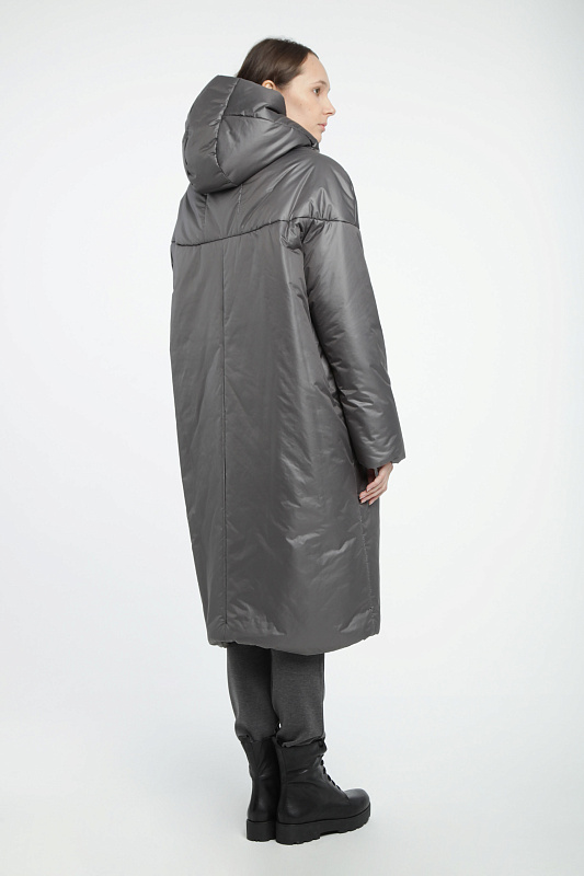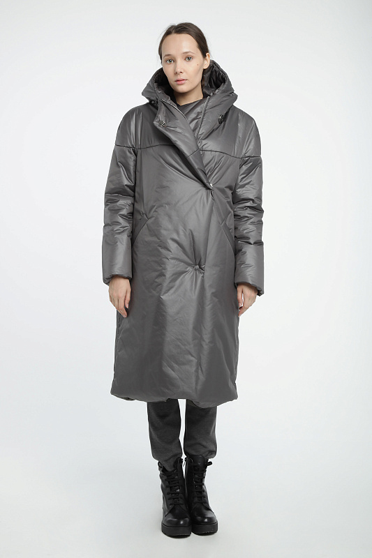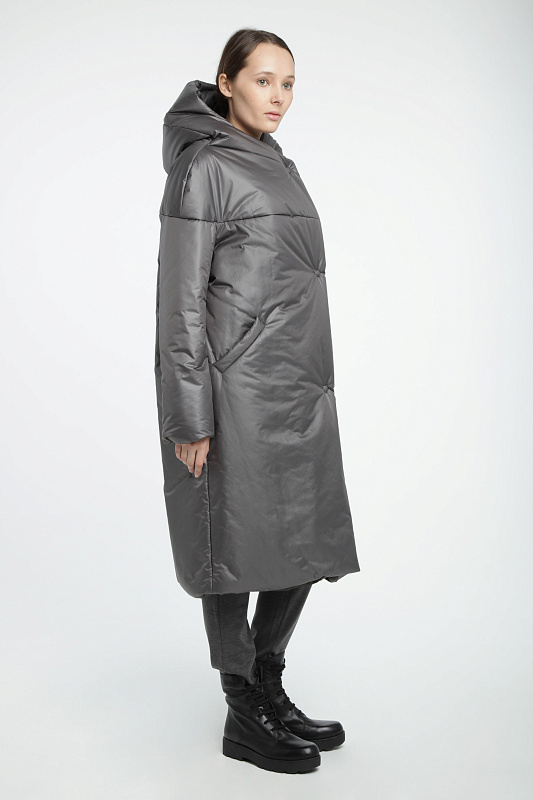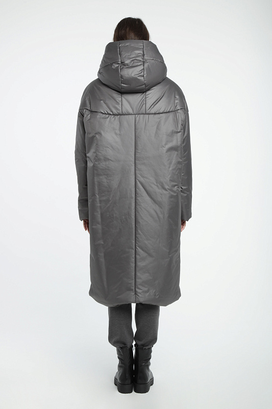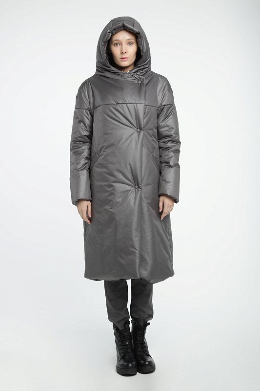 Пальто средней длины на синтепоне, с капюшоном, на молнии и пуговицах.