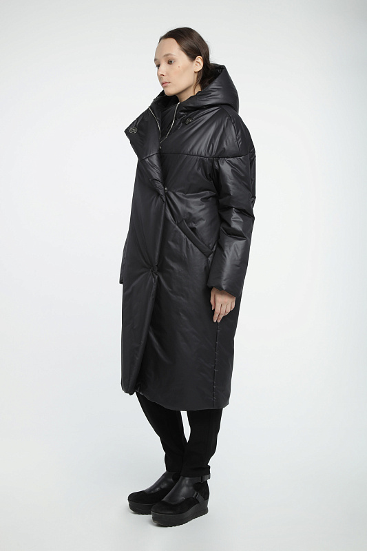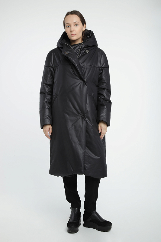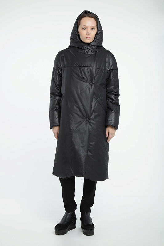 Пальто средней длины на синтепоне, с капюшоном, на молнии и пуговицах.