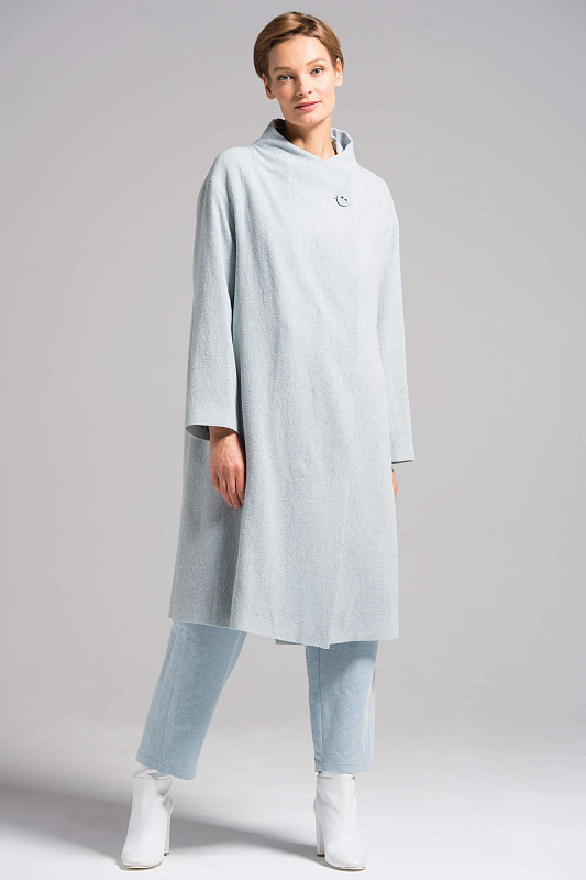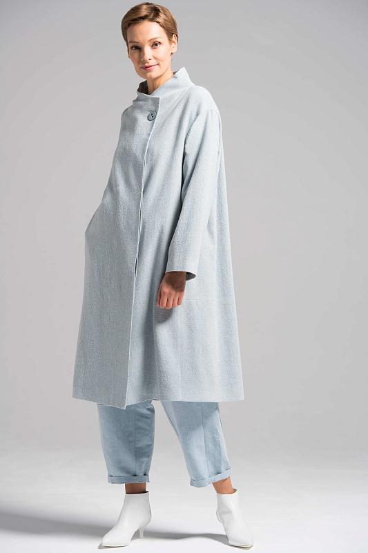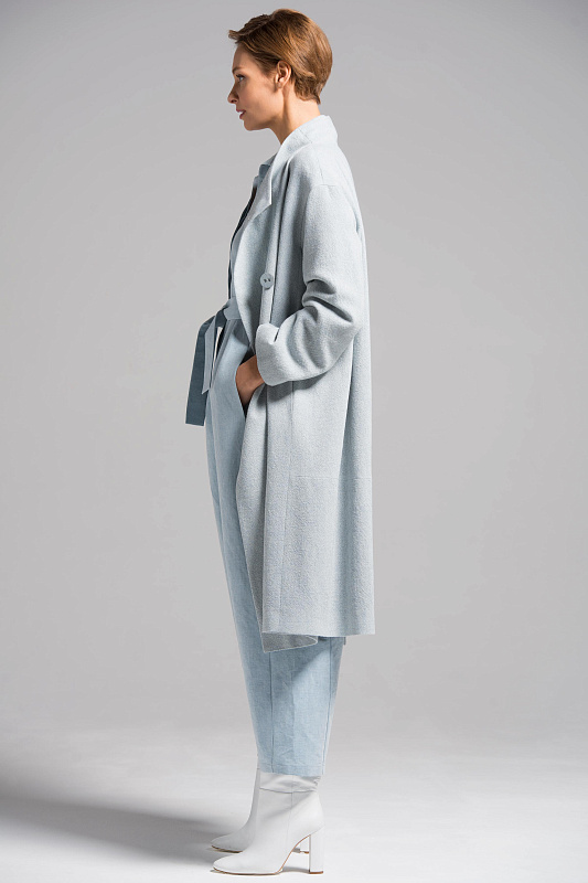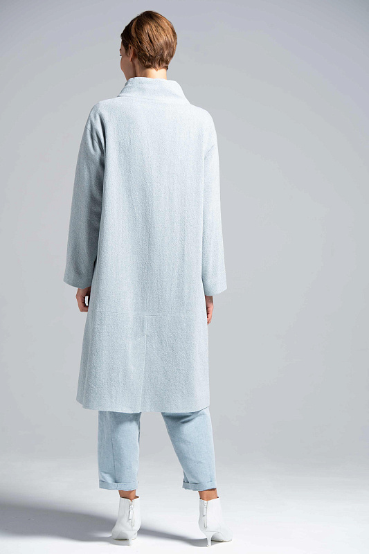 Легкое и элегантное пальто на подкладке, со шлицей, с воротником-стойкой цельнокроеным по полочке. Пальто сложной авторской конструкции - спущенная линия плеча, ластовица, переходящая в бочок, прямой силуэт, потайная застежка, карманы внутри шва. Модель выполнена из тонкой итальянской шерсти, подкладка – нежная и воздушная вискоза.