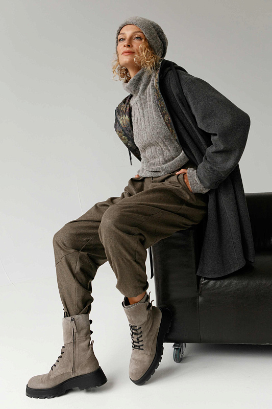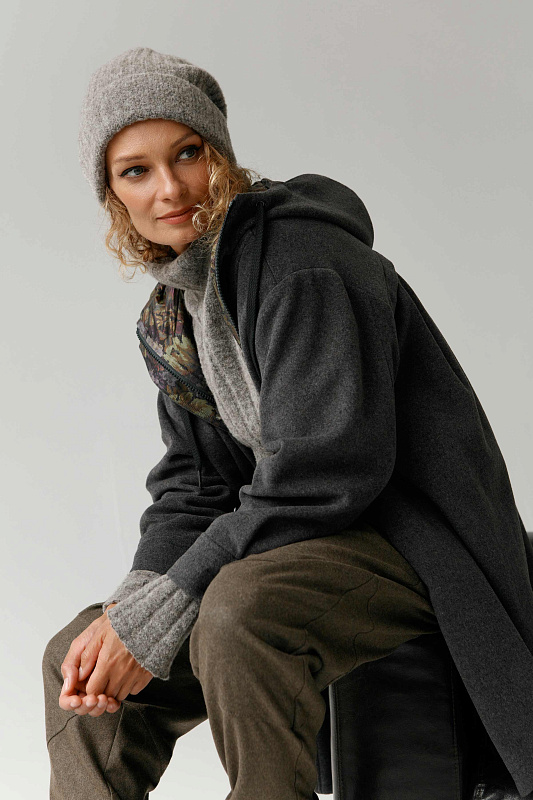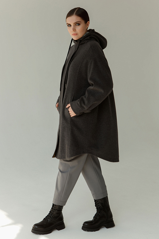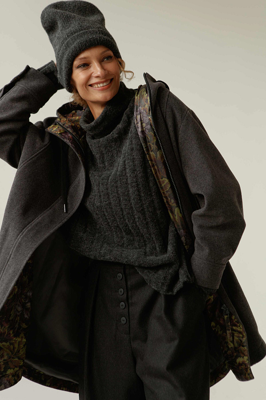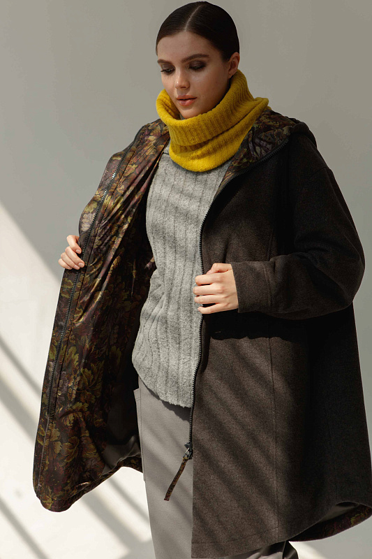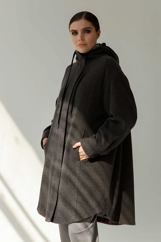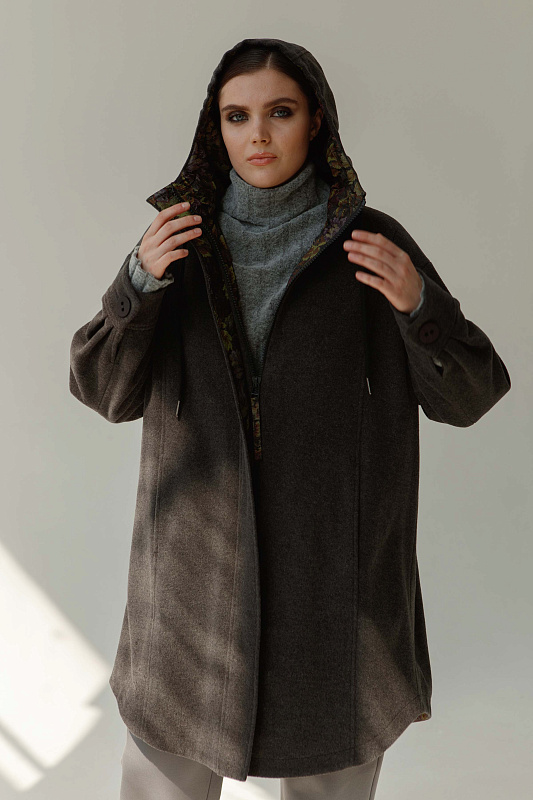 Комфортное пальто средней длины с капюшоном из мягкой ткани на оригинальной комбинированной подкладке. Отрезная кокетка и складки по спинке. Застежка-молния скрыта планкой. Прямая линия борта. Карманы в передне-боковых швах. Рукава на манжетах с пуговицами.