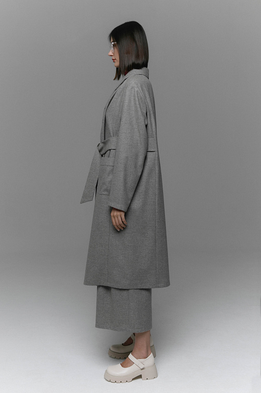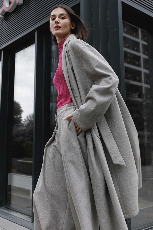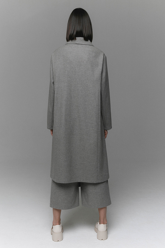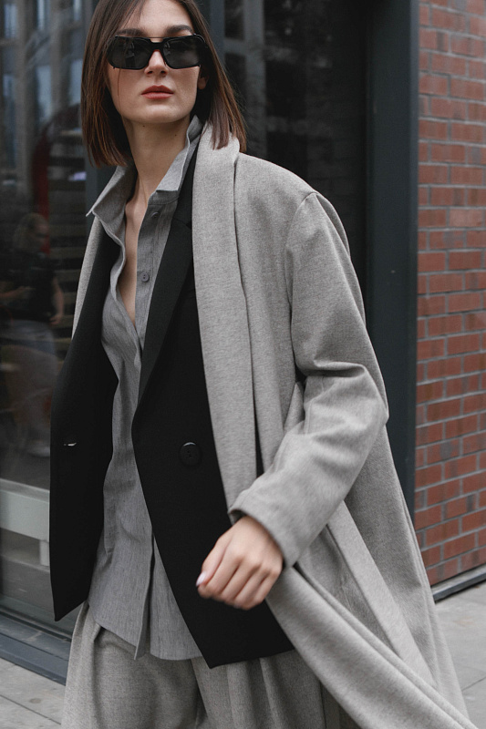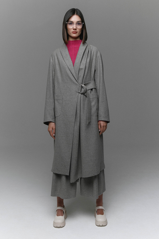 Пальто без подкладки из твилла оригинальной дизайнерской конструкции легкое и одновременно теплое. ЗапАх и регулируемая застежка на металлические полукольца добавляют образу расслабленности, а два накладных кармана - функциональности. Воротник-шалька выгодно подчеркивает шею, оставляя пространство для палантина или объемного шарфа. За счет чуть спущенной линии плеча пальто выглядит вальяжно и стильно.