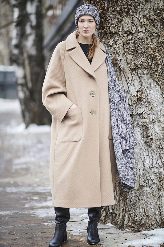Размер 03 подойдет на 56 российский. Пальто бежевое шерстяное свободного силуэта на полных девушек с оригинальной комбинированной конструкцией рукава. Теплое пальто с широкими лацканами и накладными карманами, застежка на пуговицы.