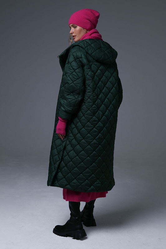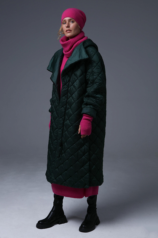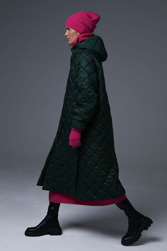 Стеганое пальто сложной дизайнерской конструкции на подкладке. Наполнитель - современный синтепон. Асимментричная затежка-молния. Компактный капюшон. Удобные глубокие карманы в боковых швах.