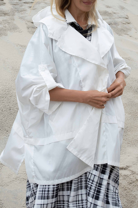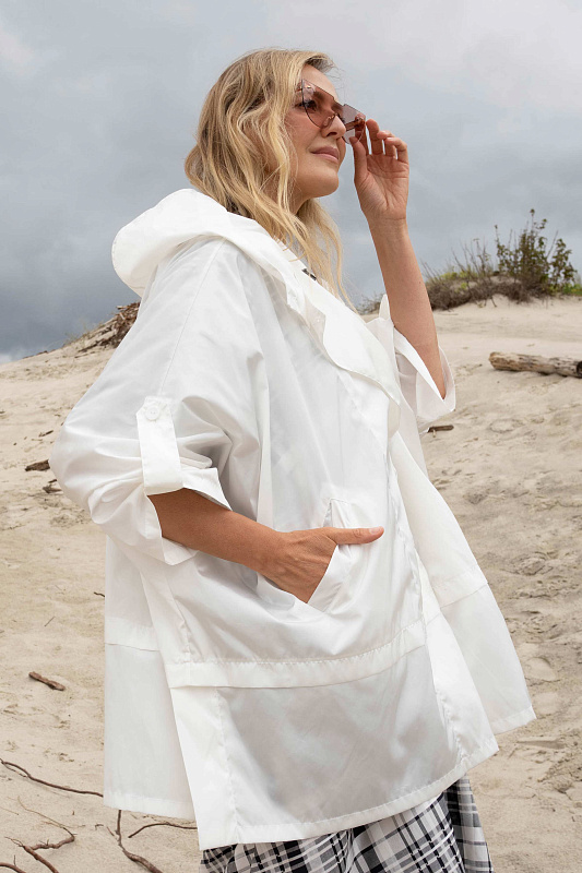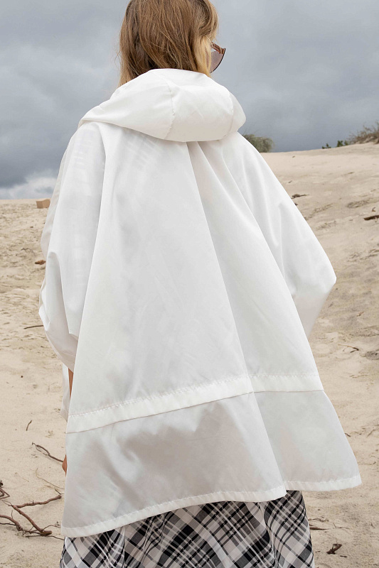 Легкий плащ без подкладки силуэта пончо. Застежка на большие пуговицы. Удобные глубокие карманы. Модель выполнены из выскоготехнологичной ткани нового поколения. Защитит Вас от ветра и дождя. Идеальная вещь для поездок.