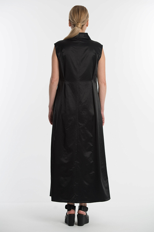 Платье длинное полуприталеного силуэта с завышенной талией сложного авторского кроя из плотной хлопковой ткани с атласной поверхностью. Застежка спереди на потайную молнию, без рукавов, в боковых швах карманы.