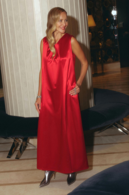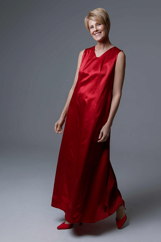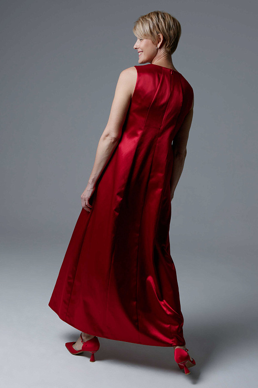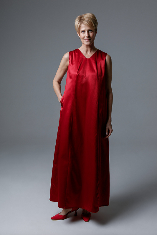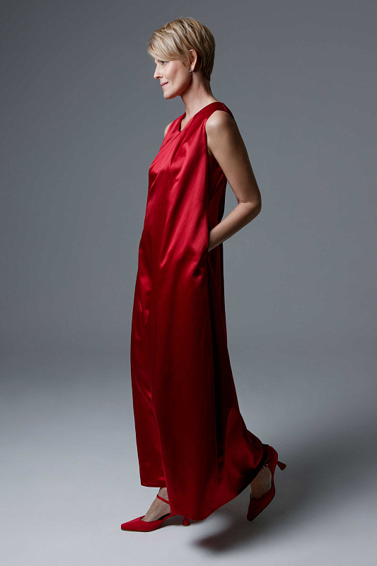 Роскошное длинное платье из премиального атласа с добавлением шелка без рукавов. Исполнено в трендовом оттенке кармин и в любой обстановке привлечет к себе внимание. Платье имеет А-силуэт. Отсутствие рукавов выигрышно подчеркивает зону плеч. Нижняя часть проймы оформлена ластовицей. Элегантный, слегка закругленный V-образный вырез. Удобные карманы в боковых швах.