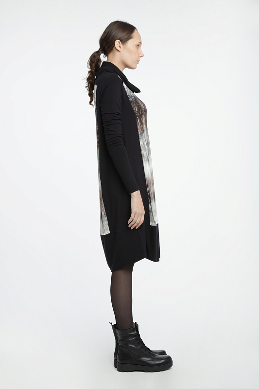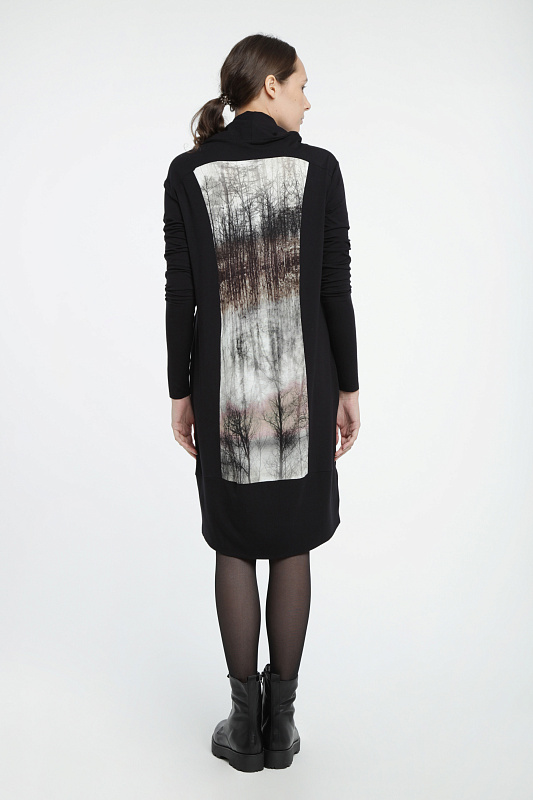 Платье силуэта баллон. Сочетание черного трикотажа и основного принта осенне-зимней коллекции Деревья. Принт визуально вытягивает линии, за счет чего платье очень стройнит. Горловина широкой стойкой.