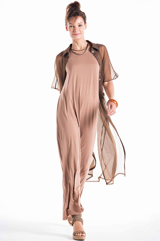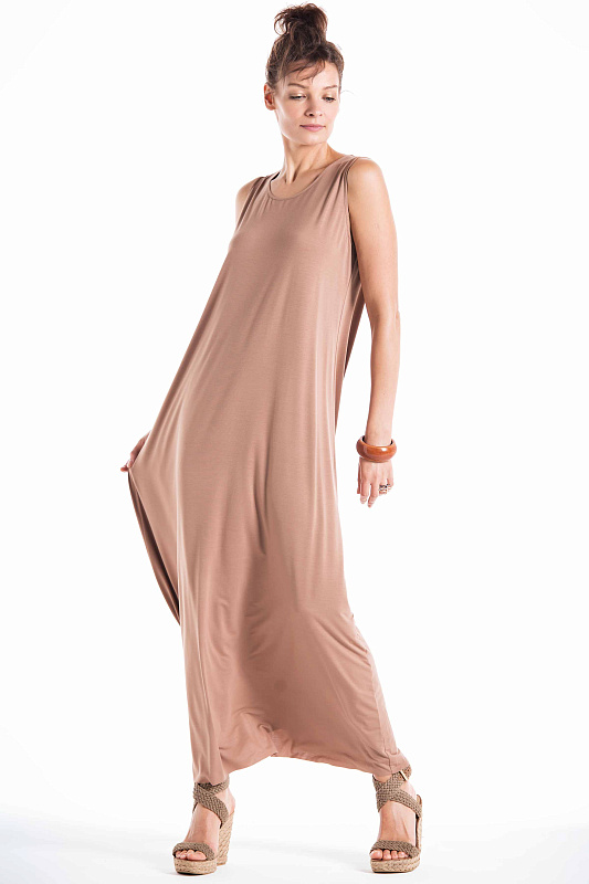 Длинное базовое платье минималистичного полуоблегающего силуэта с легким расклешением, без рукавов, с круглым вырезом горловины из мягкого струящегося вискозного трикотажа. Длина по спинке 141см.