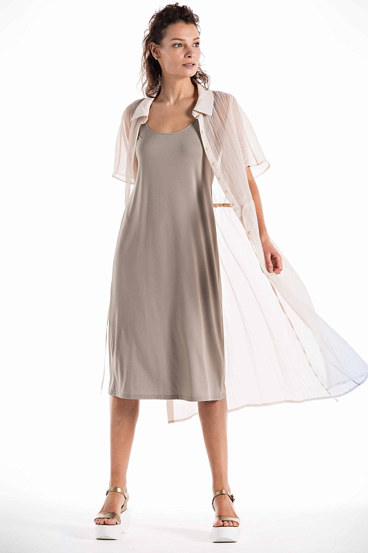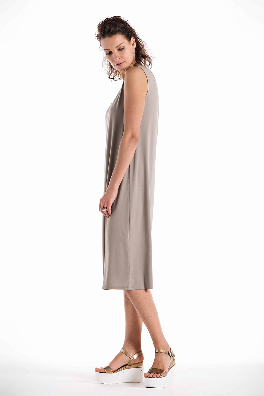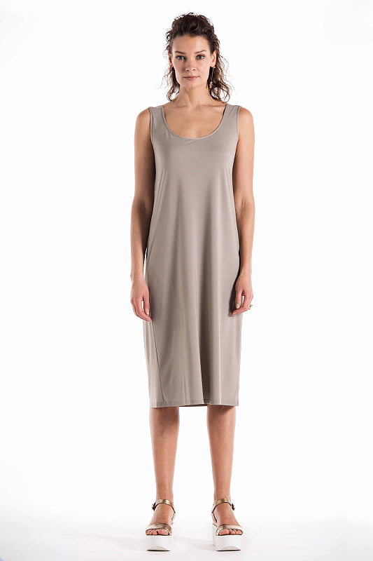 Базовое трикотажное платье полуприлегающего силуэта без рукавов и с глубоким круглым вырезом горловины. Идеальная основа для многослойных полупрозрачных комплектов. Длина по спинке от выреза горловины 117см.
