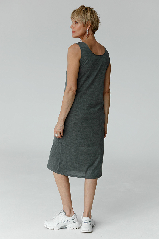 Базовое трикотажное платье полуприлегающего силуэта без рукавов и с глубоким круглым вырезом горловины. Идеальная основа для многослойных полупрозрачных комплектов.