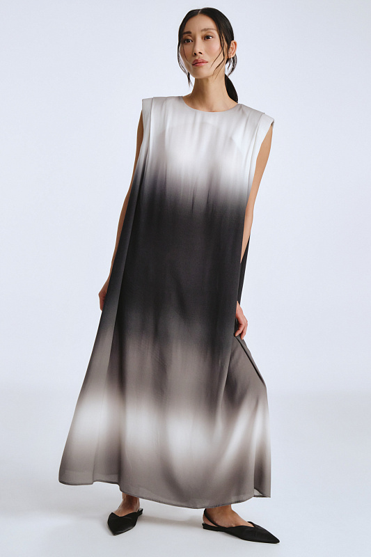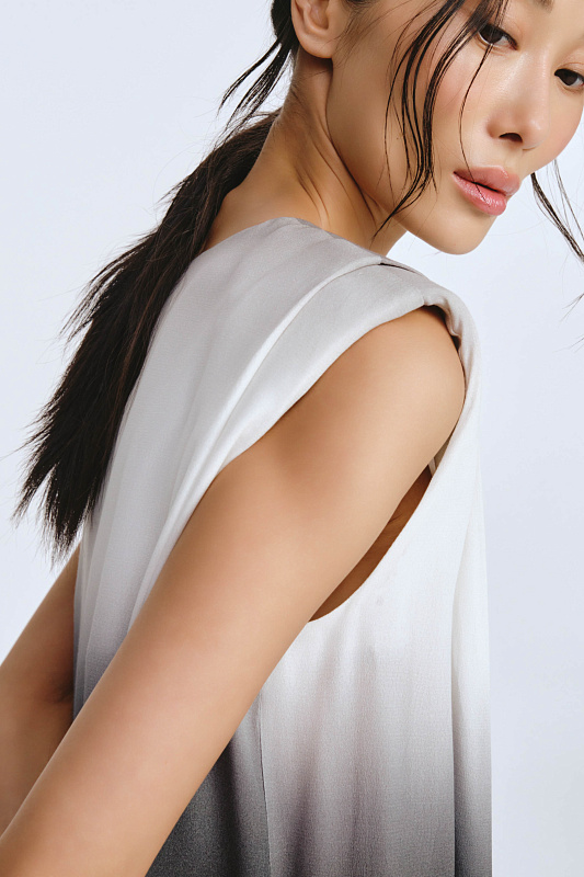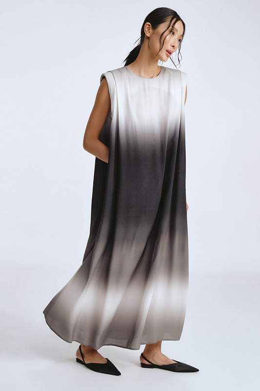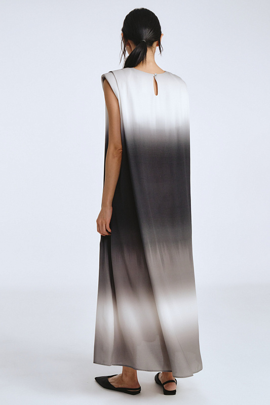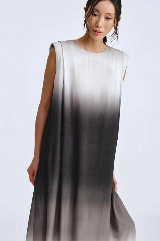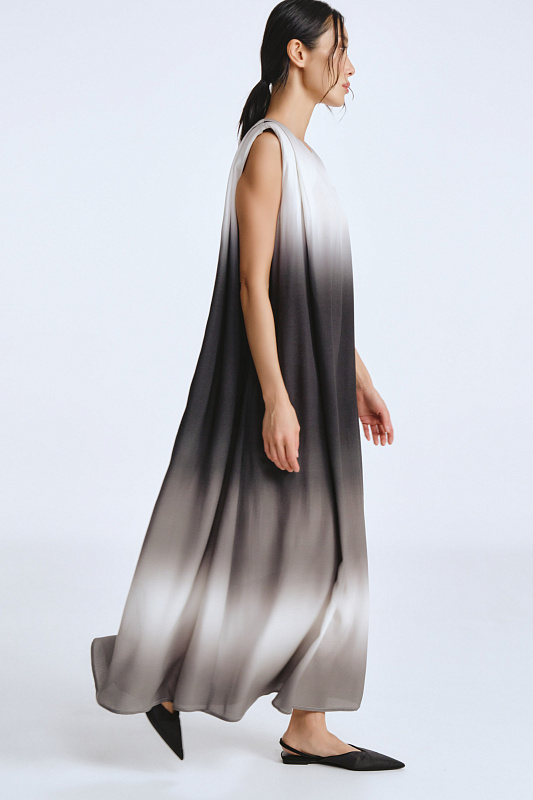 Это не просто платье — это символ, который превращает каждое движение в жест королевы. Отсутствие рукавов подчеркивает свободу и дерзость, открывая плечи. Застёжка-капелька с пуговицей сзади обеспечивает удобство. Силуэт «мантия» — драпировка ниспадает мягкими волнами, словно крылья, обволакивая фигуру. Карманы спрятаны в драпировке и абсолютно незаметны. Увеличенная за счет подплечников линия плеча создает поистине мистический образ. Но главная магия — в ткани с эффектом деграде. Переливы цвета, как бегущая вода, от насыщенных тонов к нежным полутонам. В таком платье Вы не идете, Вы шествуете.