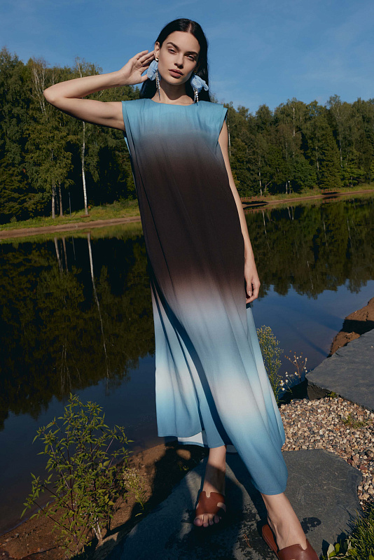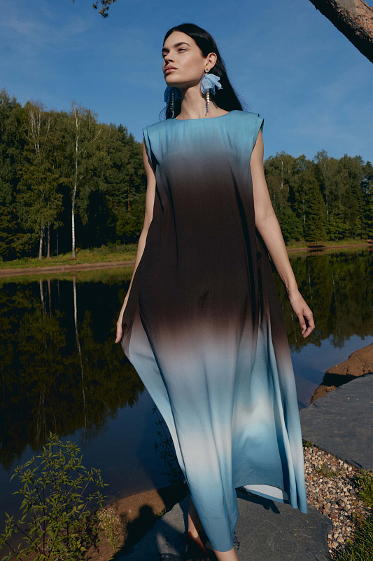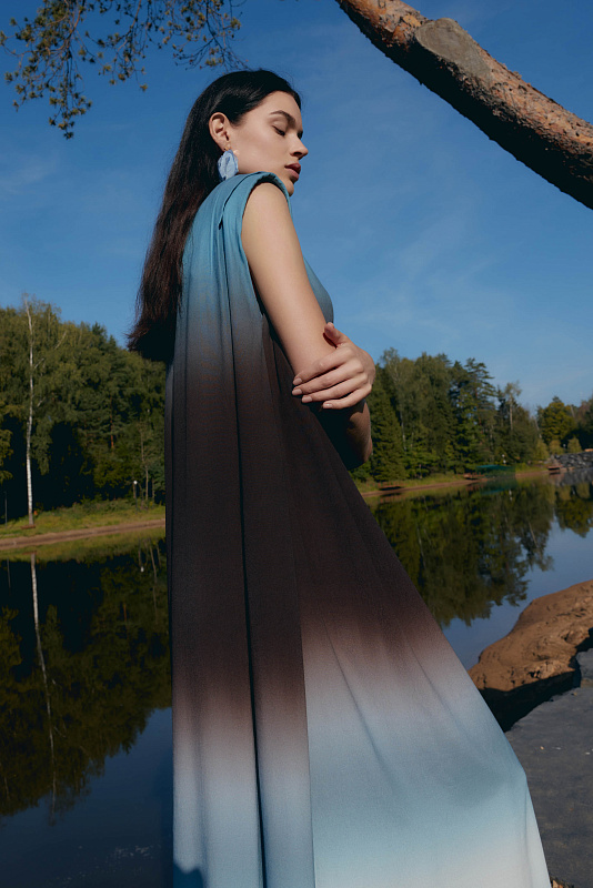 Это не просто платье — это символ, который превращает каждое движение в жест королевы. Отсутствие рукавов подчеркивает свободу и дерзость, открывая плечи. Застёжка-капелька с пуговицей сзади обеспечивает удобство. Силуэт «мантия» — драпировка ниспадает мягкими волнами, словно крылья, обволакивая фигуру. Карманы спрятаны в драпировке и абсолютно незаметны. Увеличенная за счет подплечников линия плеча создает поистине мистический образ. Но главная магия — в ткани с эффектом деграде. Переливы цвета, как бегущая вода, от насыщенных тонов к нежным полутонам. В таком платье Вы не идете, Вы шествуете.