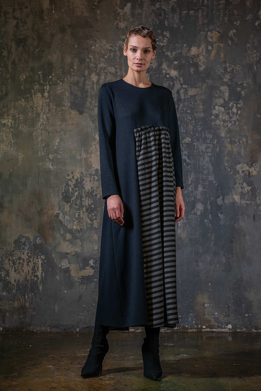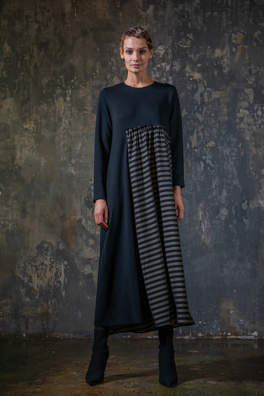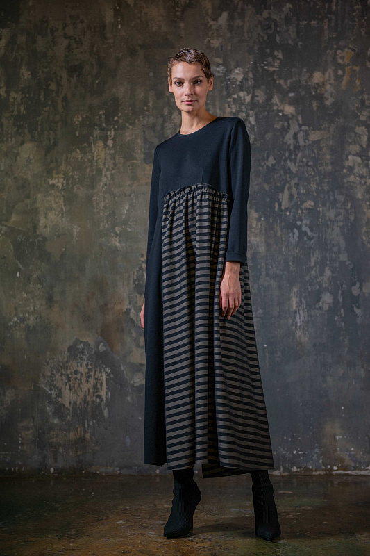 Длинное трикотажное платье А-силуэта. Круглый вырез горловины, длинный рукав. Ткань — джерси в комбинации с нежной вискозой.