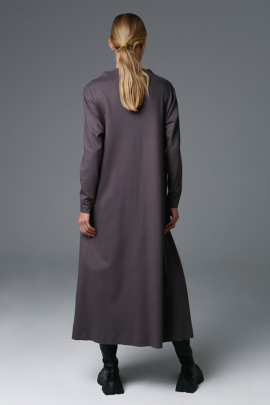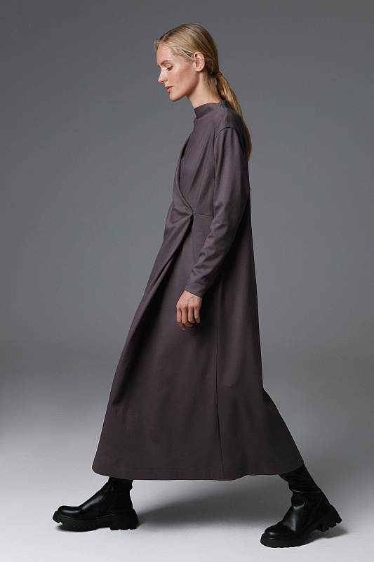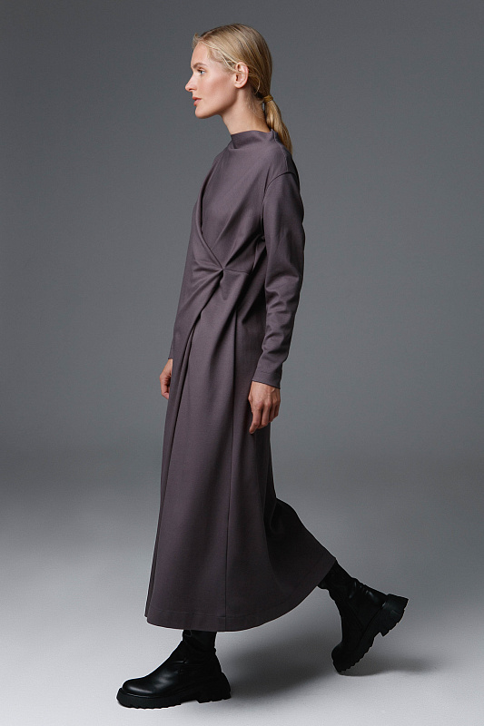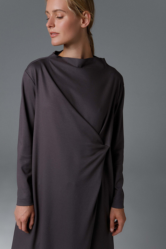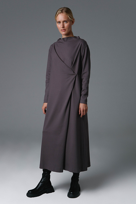 Комфортное платье с оригинальной драпировкой из плотного джерси с эластаном. Горловина - мягкая стойка. Рукава втачные. Карманы в боковых швах.