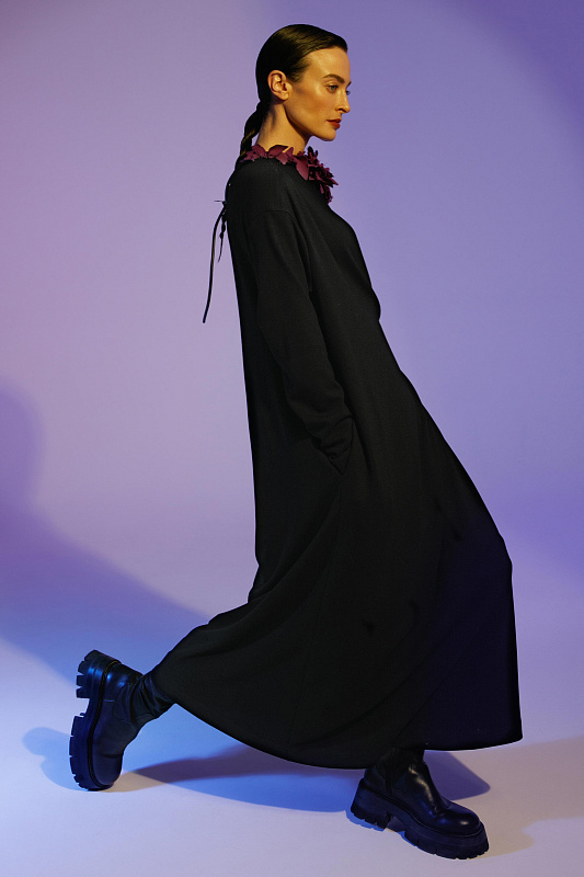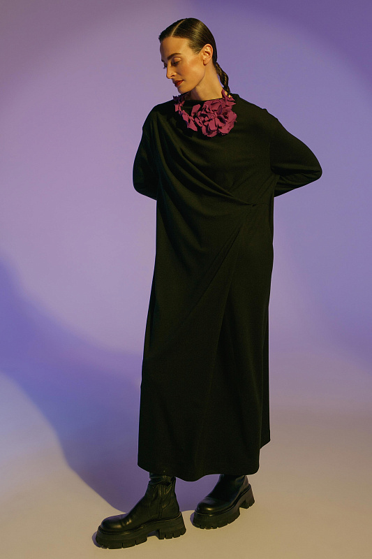 Комфортное платье с оригинальной драпировкой из плотного джерси с эластаном. Горловина - мягкая стойка. Рукава втачные. Карманы в боковых швах.