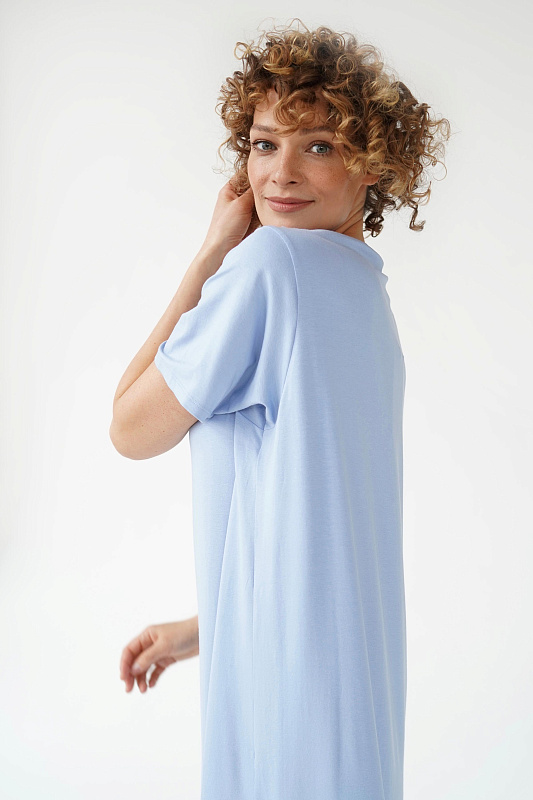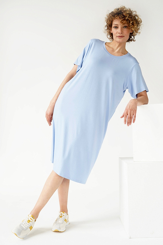 Базовое платье-футболка прямого силуэта из нежной вискозы с небольшим добавлением эластана. Ворот горловины круглый, втачные рукава чуть выше локтя, спущенная линия плеча.