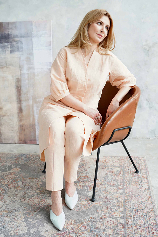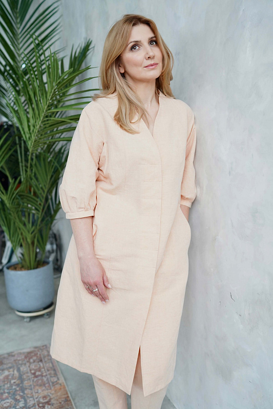 Оригинальное платье силуэта «песочные часы» на супатной застежке с рукавами-буфами. V-образный вырез, карманы в боковых швах. Прекрасно в сочетании с кожаным поясом или тканевым кушаком. Возможный вариант носки – в качестве легкого летнего пальто.