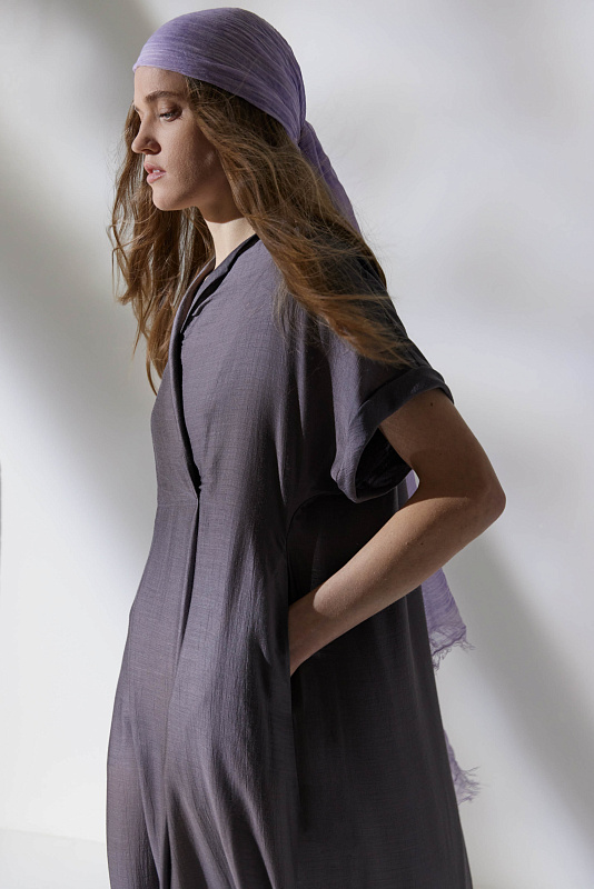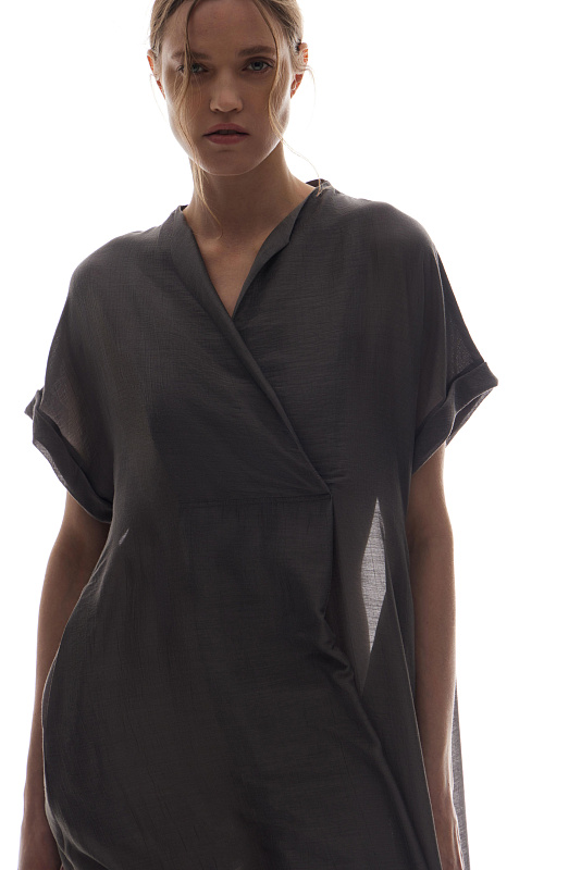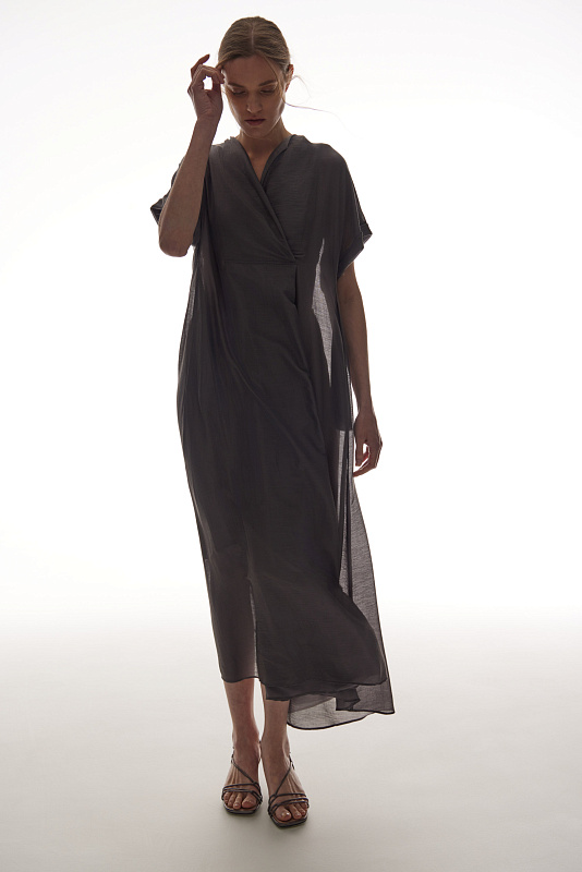 Легкое платье летящего силуэта клеш выполнено из микромодала с добавлением шелка. ЗапАх с отстрочкой эффектно подчеркивает линию шеи. Две глубокие горизональные складки по переду и спинке добавляют модели многслойности, а удобные карманы - расслабленности.