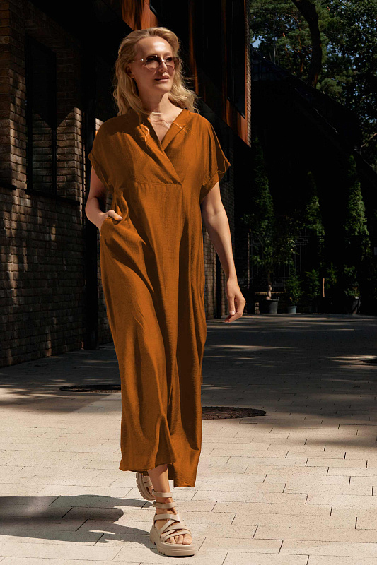 Легкое платье летящего силуэта клеш выполнено из микромодала с добавлением шелка. ЗапАх с отстрочкой эффектно подчеркивает линию шеи. Две глубокие горизональные складки по переду и спинке добавляют модели многслойности, а удобные карманы - расслабленности.