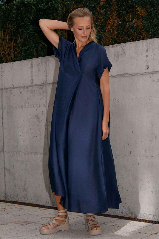 Легкое платье летящего силуэта клеш выполнено из микромодала с добавлением шелка. ЗапАх с отстрочкой эффектно подчеркивает линию шеи. Две глубокие горизональные складки по переду и спинке добавляют модели многслойности, а удобные карманы - расслабленности.