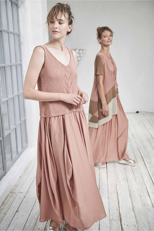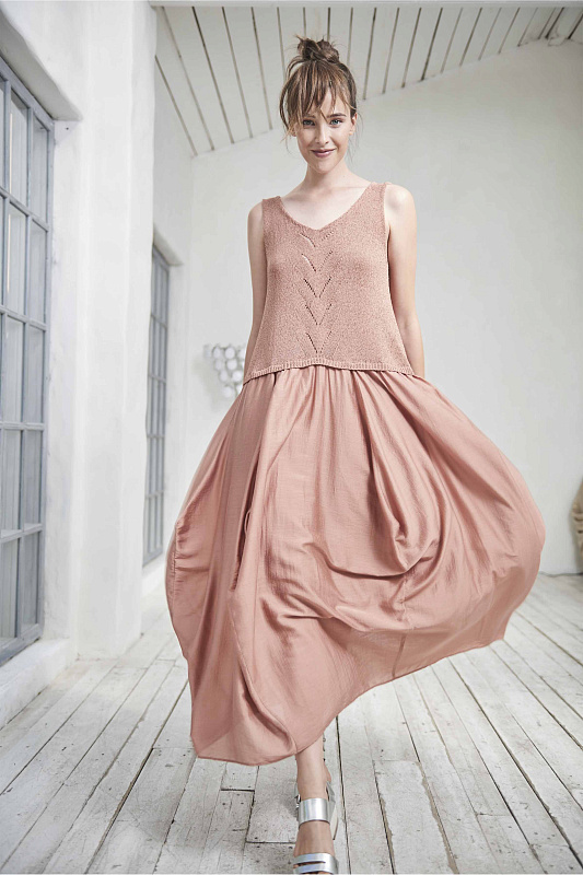Платье оригинальной конструкции комбинированное с трикотажным верхом. Верх - топ без рукавов из итальянской пряжи, ажурной вязки с V -образным вырезом горловины. Низ - легкая шелковая юбка -парашют авторской конструкции. Длина изделия по спинке около 140 см.