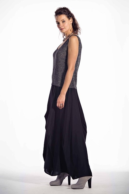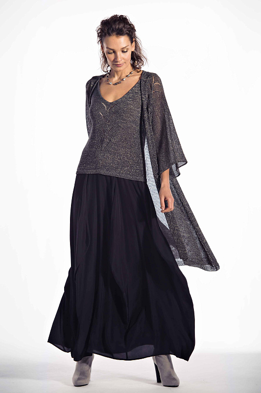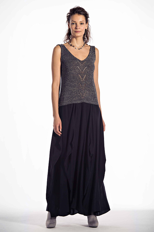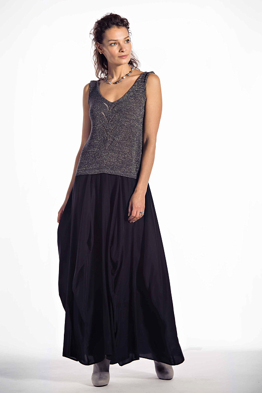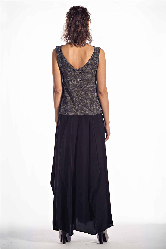 Платье оригинальной конструкции комбинированное с трикотажным верхом. Верх - топ без рукавов из итальянской пряжи, ажурной вязки с V -образным вырезом горловины. Низ - легкая шелковая юбка -парашют авторской конструкции. Длина изделия по спинке около 140 см.