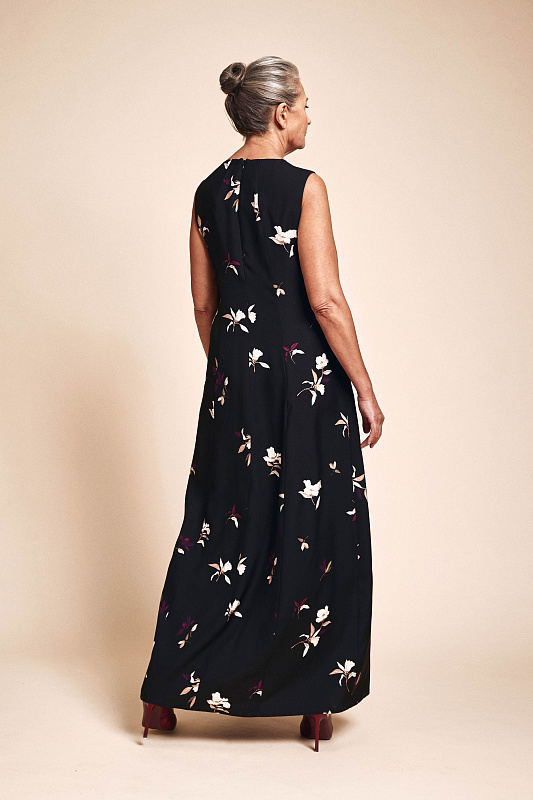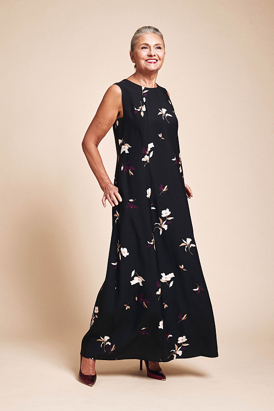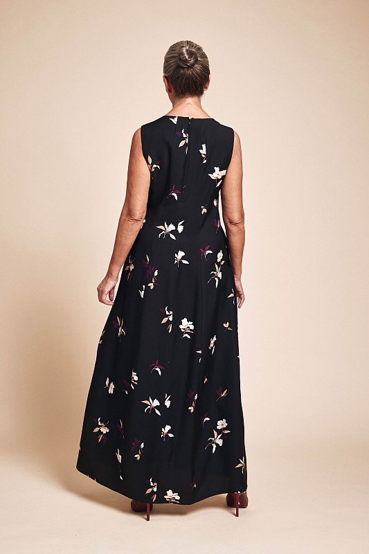 Женственное платье клёш без рукавов, на потайной молнии. Полуприлегающий топ платья плавно переходит в расклешенную юбку. Платье выполнено из нежной вискозы.