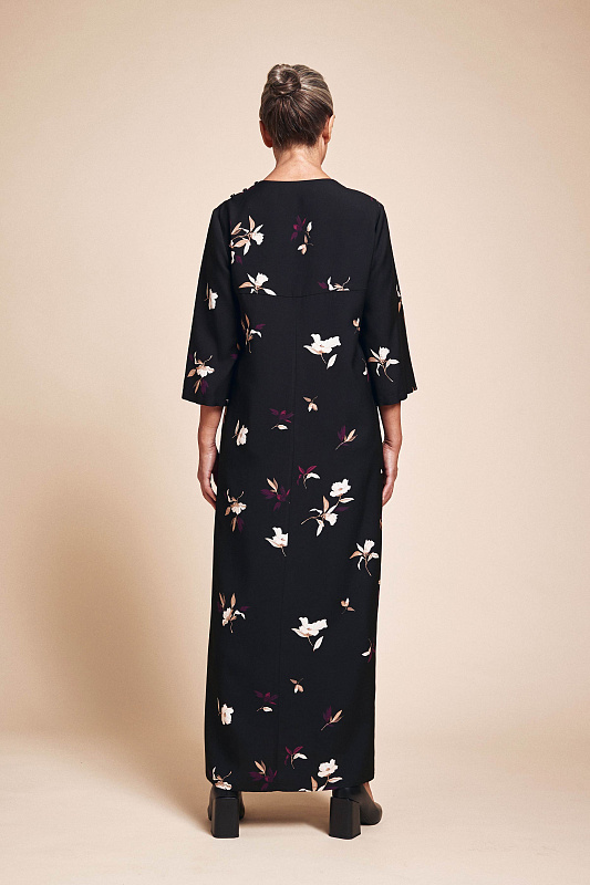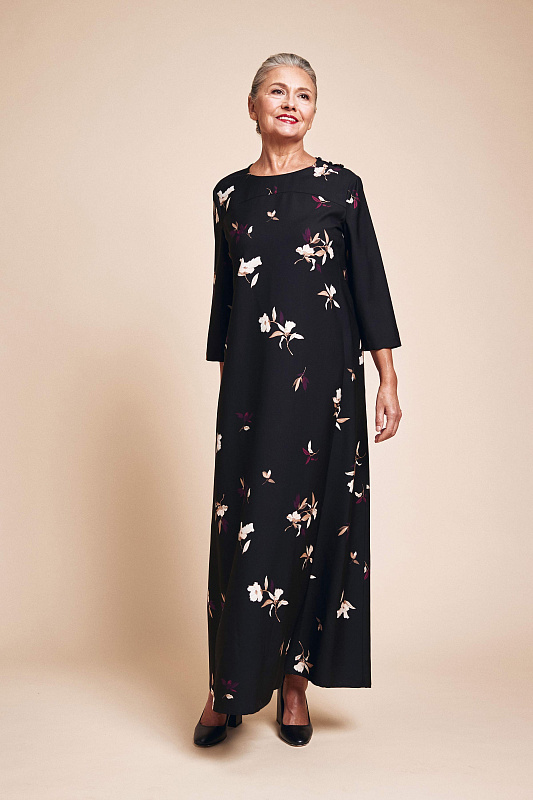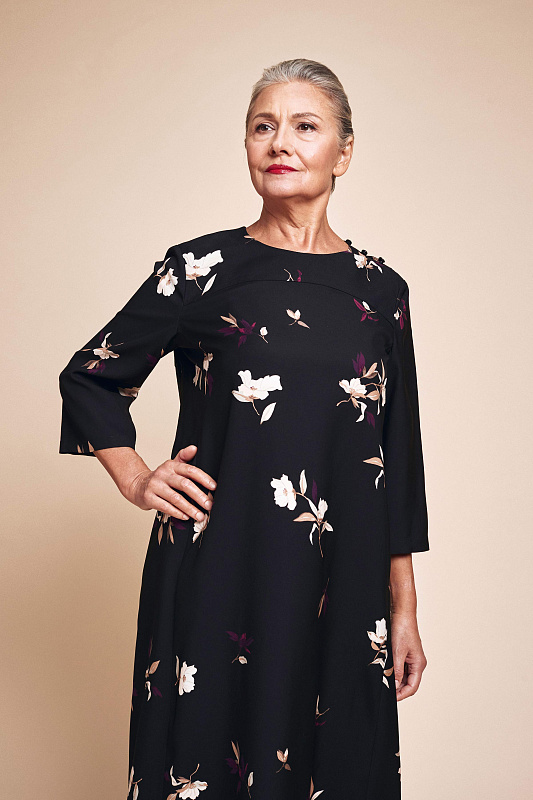Платье А-силуэта из нежной вискозы, с круглым вырезом горловины и втачным рукавом длиной до локтя. Застегивается на маленькие пуговки-грибочки на левом плечевом шве. Ткань нежная и плотная вискоза.