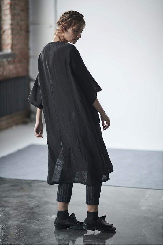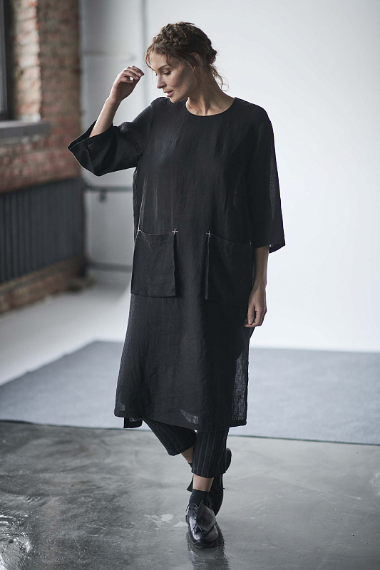 Платье-туника прямого кроя, полуприлегающий силуэт, спущенная линия плеча, рукав 7/8, круглый вырез горловины с выточкам. Туника на потайной молнии, с не глубокими боковыми разрезами и накладными карманами-портфелями из легкого и экологичного льна. Длина по спинке 115 см.