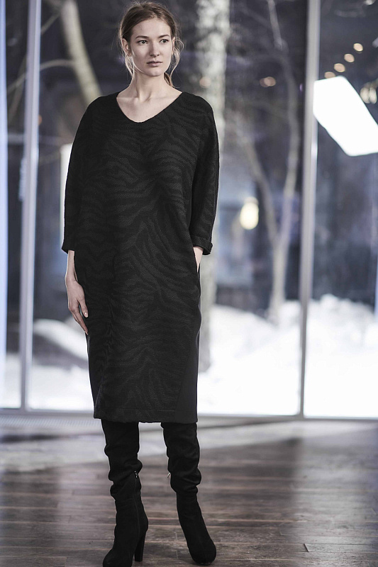 Платье овального силуэта средней длины из жаккарда. V-образная горловина, рукав 7/8, по бокам ластовицы из эластичного джерси.