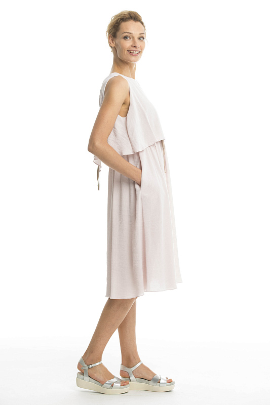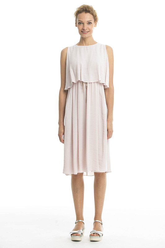 Платье средней длины из вискозной гофрированной ткани. Главные особенности кроя - это отлетная пелерина и V-образный вырез на спинке, завязывающийся на тонкие шнурочки. Внутренняя часть полочки и спинка выполнены из мягкого вискозного трикотажа. Талия чуть завышена. Под пелериной скрыта кулиска. В боковых швах карманы.