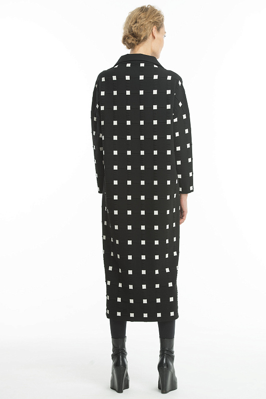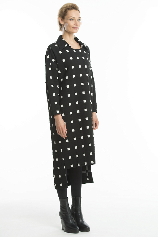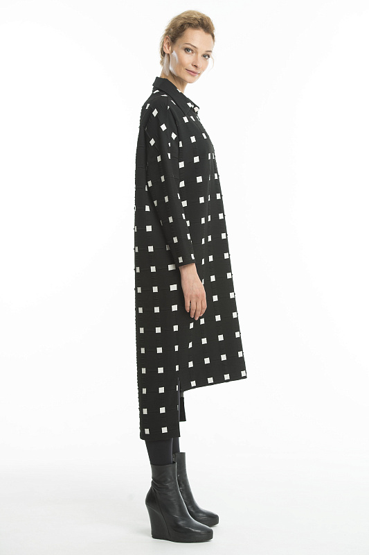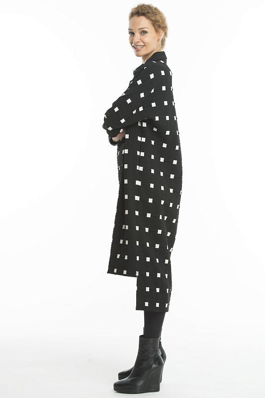 Прямое не облегающее платье с отложным воротничком. Длина рукава до запястья. В боковых швах карманы. Разнообразят традиционную форму геометрический рисунок и разноуровневый крой переда и спинки. Эффектно эта вещь будет выглядеть в комплекте с узкими брюками из фактурной жаккардовой ткани.