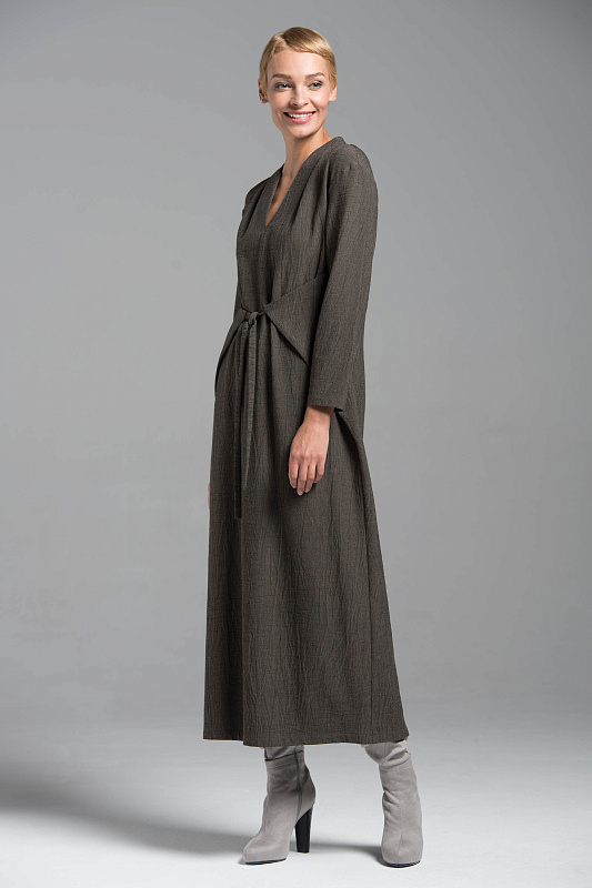 Длинное платье, А - силуэт с вытачками и швом по спинке, V-образный вырез горловины, складка из плеча, ворот - стоечка сзади и отрезной, цельнокроеный впереди, спущенная линия плеча, рукав 7/8. Платье из плотной и мягкой вискозы с хлопком позволит чувствовать себя комфортно и элегантно в условиях города, а оригинальный пояс авторской конструкции цельнокроеный из спинки прекрасно подчеркнет талию. Ткань - крэш (жатая ткань) это долговечные складки, морщины и заломы, которые создаются на ткани под строгим контролем европейских производителей.