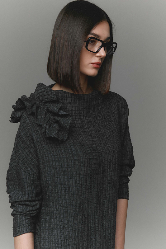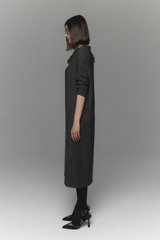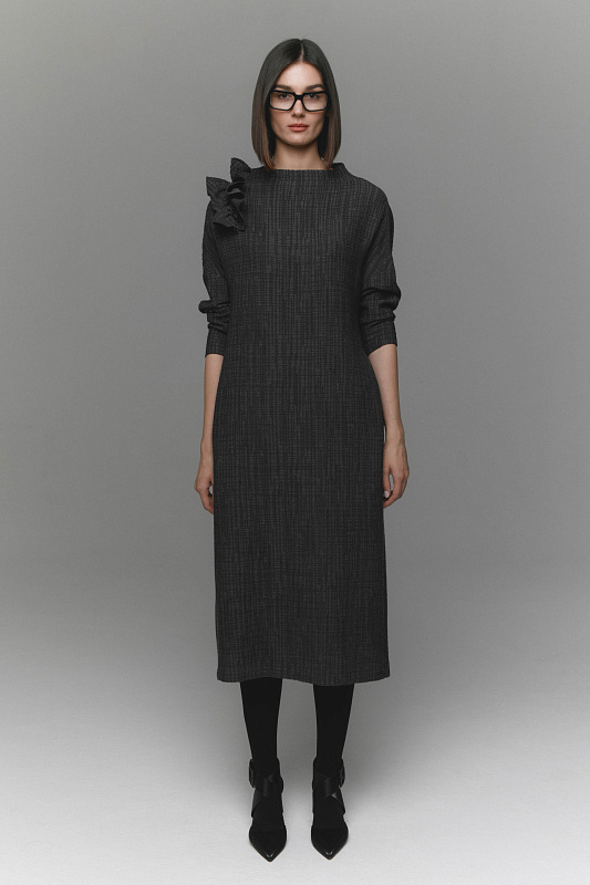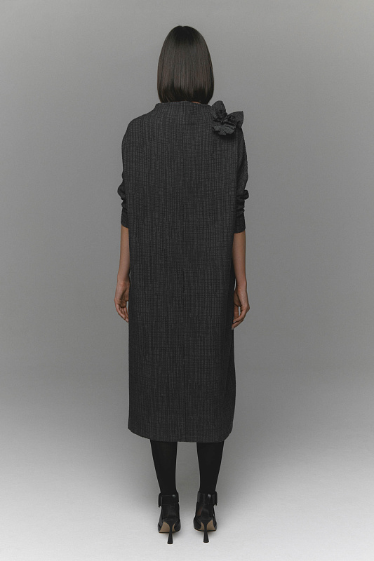 Платье прямого кроя из сложного жаккарда с эффектной съемной авторской брошью на булавке, которую можно носить как самостоятельный аксессуар. Подходит для любого типа фигуры. Тактильно приятная, фактурная ткань прекрасно тянется. Воротник – мягкая стойка, подчеркивает изящные линии шеи. Удобство при движении обеспечивает спущенная линия плеч. Вместительные карманы в боковых швах. Практичная длина позволяет носить платье как с обувью на каблуке, так и на плоской подошве.