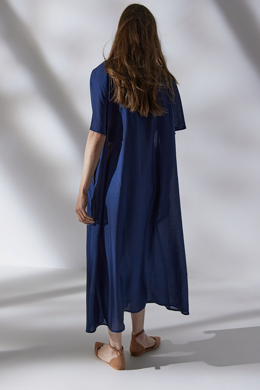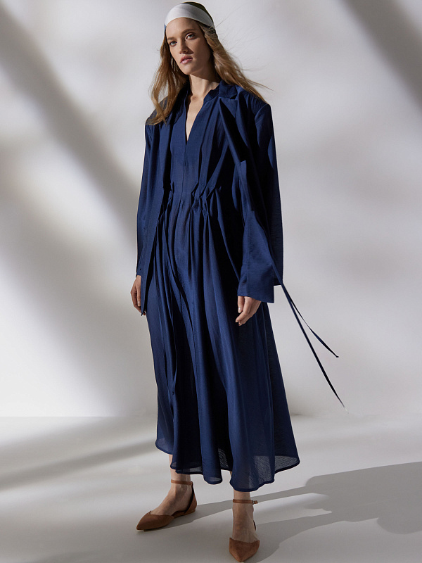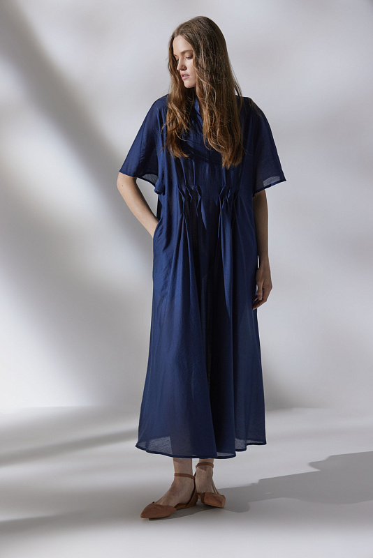 Длинное платье с рукавами реглан и V-образной горловиной, переходящей в мяткую стройку. Летящий силуэт и легкая струящаяся полупрозрачная ткань. Складки с оригинальными защипами эффектно подчеркивают линию талию. Расслабленности образу добавляют карманы в боковых швах. Для пошива модели выбран мерцающий микромодал с добавлением шелка.