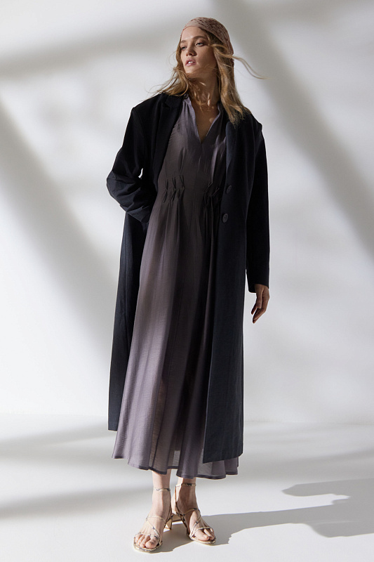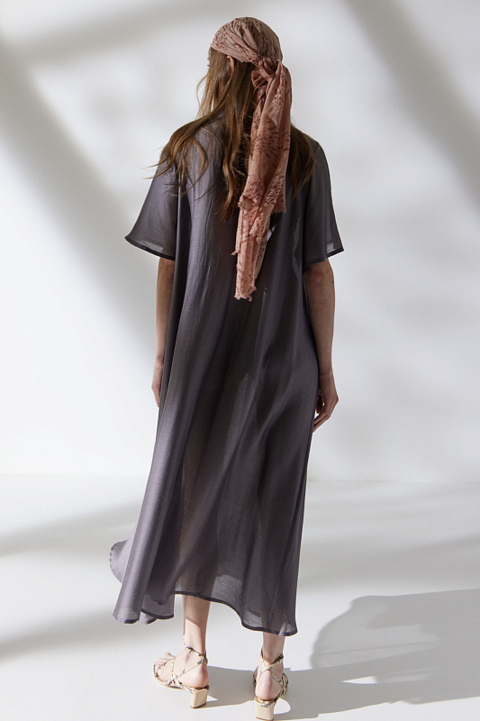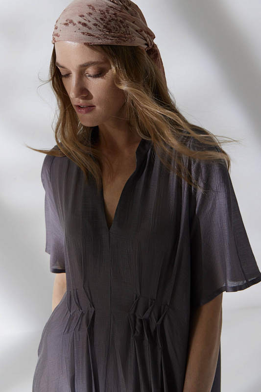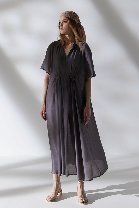 Длинное платье с рукавами реглан и V-образной горловиной, переходящей в мяткую стройку. Летящий силуэт и легкая струящаяся полупрозрачная ткань. Складки с оригинальными защипами эффектно подчеркивают линию талию. Расслабленности образу добавляют карманы в боковых швах. Для пошива модели выбран мерцающий микромодал с добавлением шелка.