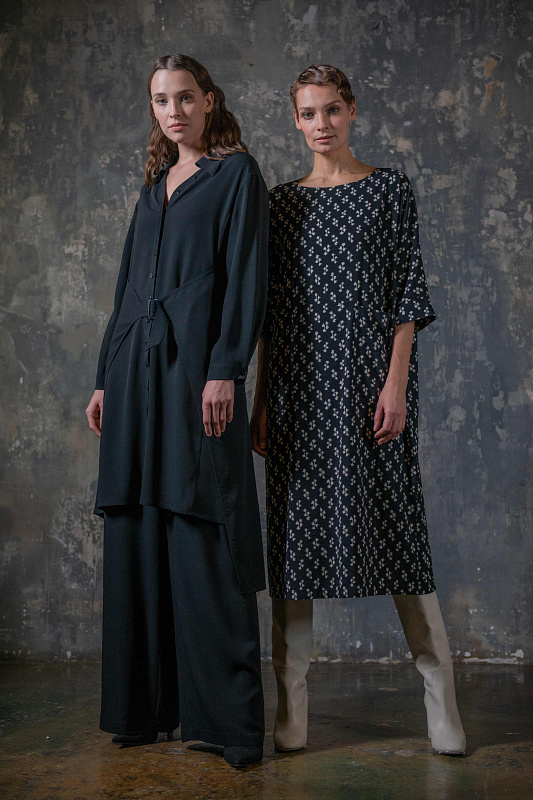 Платье оригинальной дизайнерской конструкции с запахом на пряжке. Длинный рукав на пуговицах, удлиненная спинка, рубашечный воротник. Ткань — нежная вискоза.