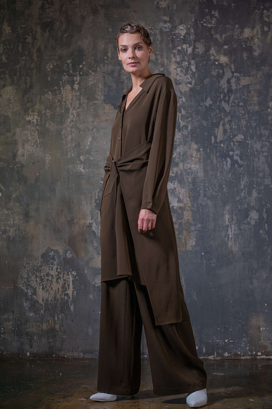 Платье оригинальной дизайнерской конструкции с запахом на пряжке. Длинный рукав на пуговицах, удлиненная спинка, рубашечный воротник. Ткань — нежная вискоза.