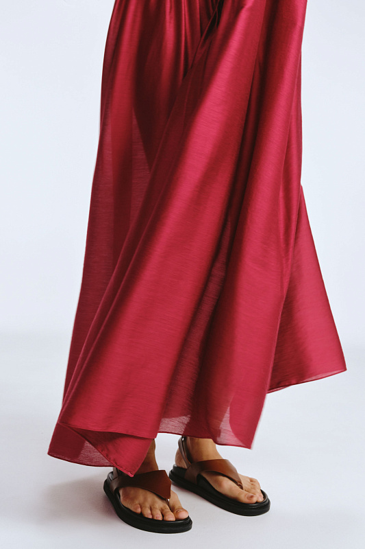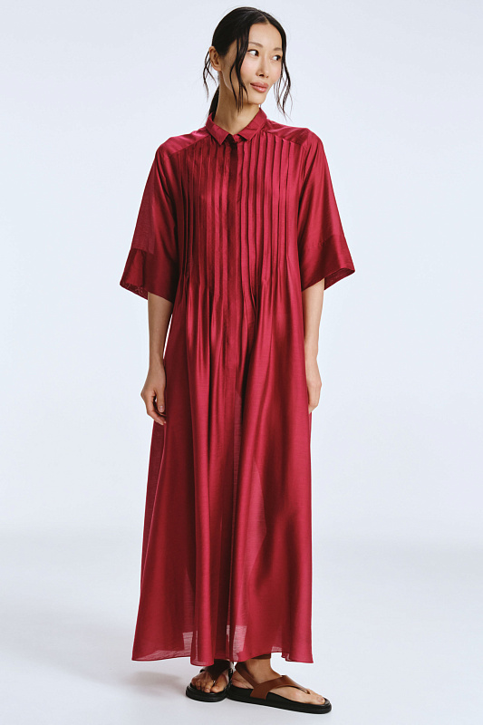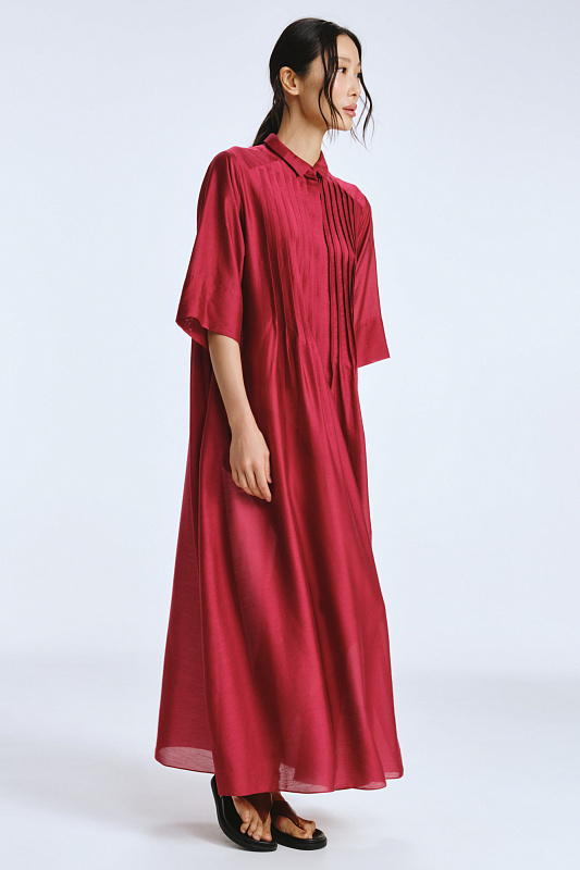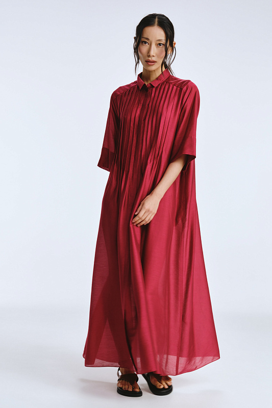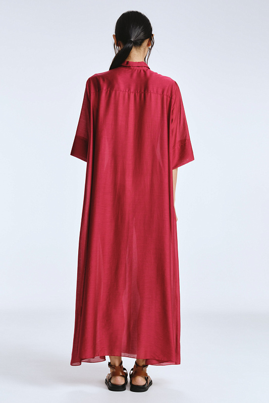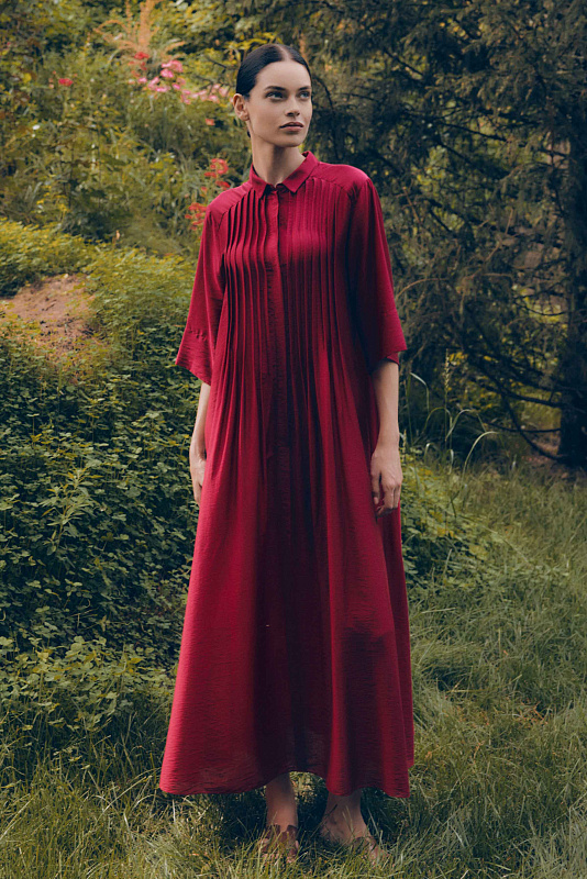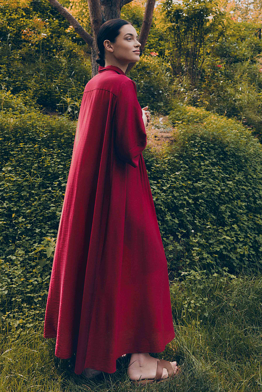 Невероятное легкое платье-рубашка летящего силуэта выполнено из микромодала с добавлением шелка. Длинное, свободное, как символ высокого статуса. Классический крой всегда остаётся в тренде благодаря всё новым и новым идеям дизайнеров. Длина рукава весьма комфортная, двойной слой ткани завершает рукав и придает законченность. Маленькие пуговицы, скрытые под планкой, и рубашечный ворот поддерживают классику образа. Защипы от линии плеча по переду пикантно скрывают скульптурность тела. От условной линии талии защипы расходятся и придают динамику при ходьбе. Вместительные карманы — не просто декор, это комфорт и удобство. Скрытый крой карманов не добавляет лишнего объема, сохраняя чистоту линий. Это платье-рубашка для тех, кто устал от скучных базовых моделей и хочет добавить в гардероб «изюминку».