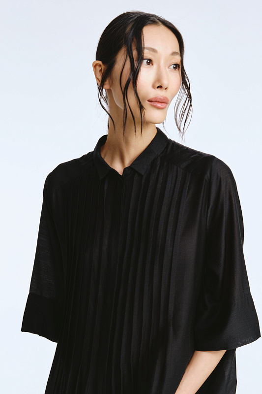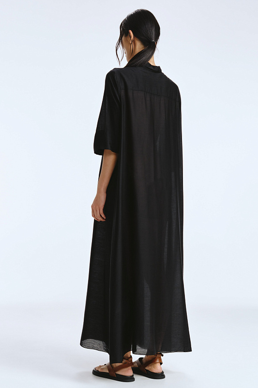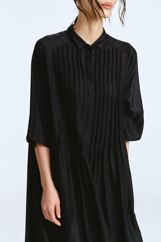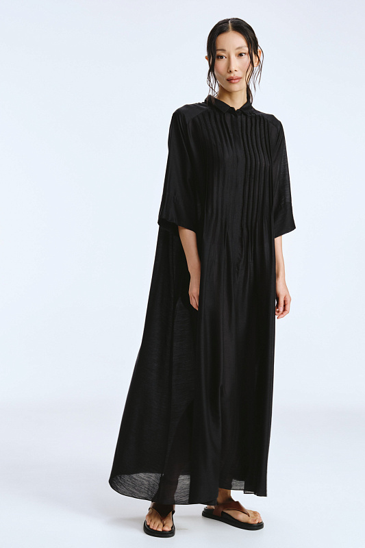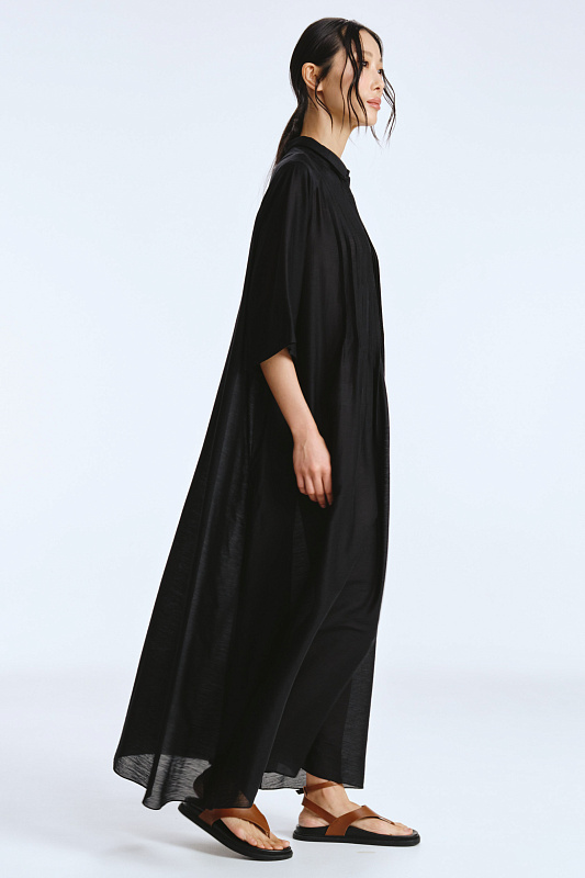 Невероятное легкое платье-рубашка летящего силуэта выполнено из микромодала с добавлением шелка. Длинное, свободное, как символ высокого статуса. Классический крой всегда остаётся в тренде благодаря всё новым и новым идеям дизайнеров. Длина рукава весьма комфортная, двойной слой ткани завершает рукав и придает законченность. Маленькие пуговицы, скрытые под планкой, и рубашечный ворот поддерживают классику образа. Защипы от линии плеча по переду пикантно скрывают скульптурность тела. От условной линии талии защипы расходятся и придают динамику при ходьбе. Вместительные карманы — не просто декор, это комфорт и удобство. Скрытый крой карманов не добавляет лишнего объема, сохраняя чистоту линий. Это платье-рубашка для тех, кто устал от скучных базовых моделей и хочет добавить в гардероб «изюминку».